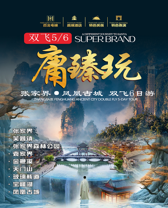 后游有张家界“武陵之魂”美誉的 5A景点新传奇,湘西神山【天门山国】乘坐“世界第一”长的高山客运索道,全长 7455 米,体验凌空飞仙般的神奇感觉,直 达天门山云梦仙顶,山体孤峰高耸,气势临空独尊,观赏奇妙美丽的盆景花园,体验【玻璃栈道】这条 看着就让人腿软的玻璃栈道给人带来的刺激震撼感,感受“云在脚下,奇峰尽览,万象目中”的豪迈感觉。【通天大道】:被称为通天大道的盘山公路共计 99 弯,“天下第一公路奇观”横空出世,垂直高差达 千米左右。【天门洞开】:999 级台阶登上天门洞,观俄罗斯空军特技飞行表演在天门山上穿越的世界最 高的天然穿山溶洞,感受大自然的神奇造化,尽情欣赏天门洞内外的壮丽景色。