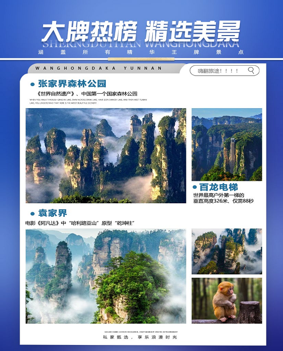 早餐后,游览张家界森林公园【天子山景区】(游览时间不少于2小时),“谁人识得天子面,归来不看天下山”途观贺龙公园、御笔峰、仙女献花、西海石林;后乘环保车前往游览“鬼斧神工”之作的《阿凡达》外景拍摄地“哈利路亚山”【袁家界景区】(游览时间不少于2小时),探寻影视阿凡达中的群山漂浮、星罗棋布的玄幻莫测世界;后乘坐百龙天梯下山。