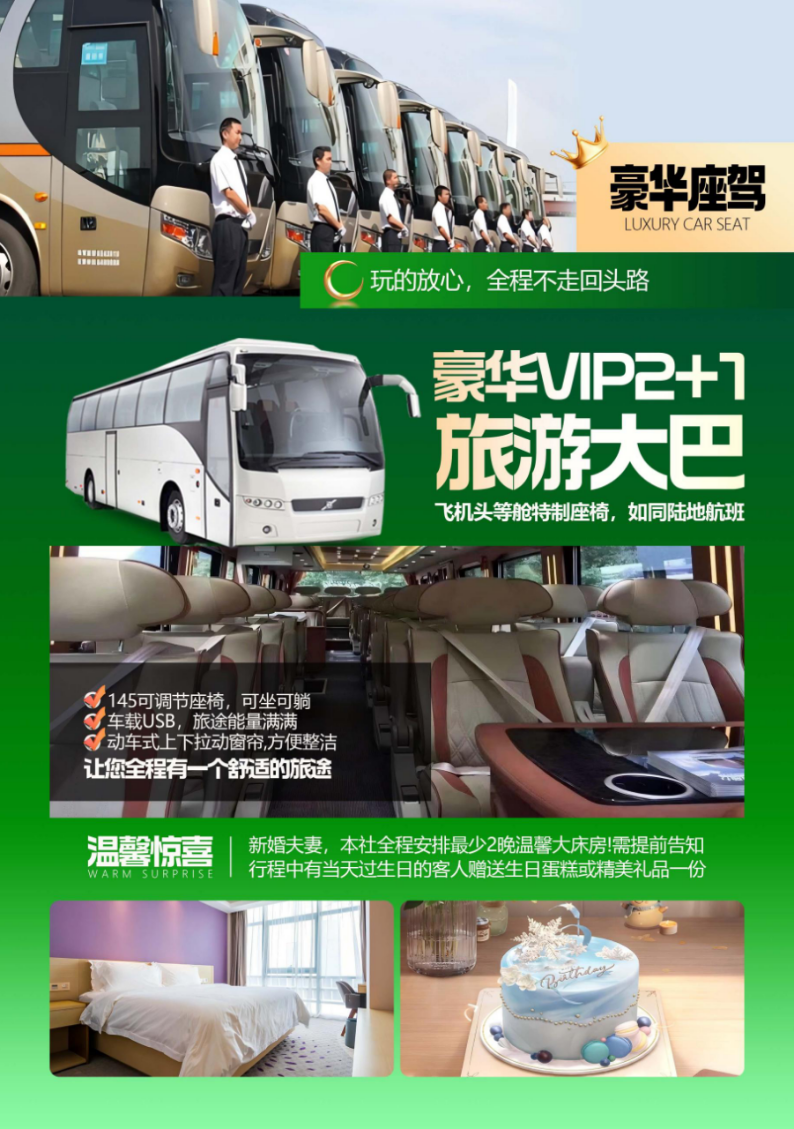 4、交通:特别安排豪华VIP2+1旅游大巴(飞机头等舱特制座椅,如同陆地航班), 让您全程有一个舒适的旅途,玩的放心,玩的更轻松!(如遇特殊情况,用车紧张时则备选豪华旅游车,保持15%的空座率,望知悉)