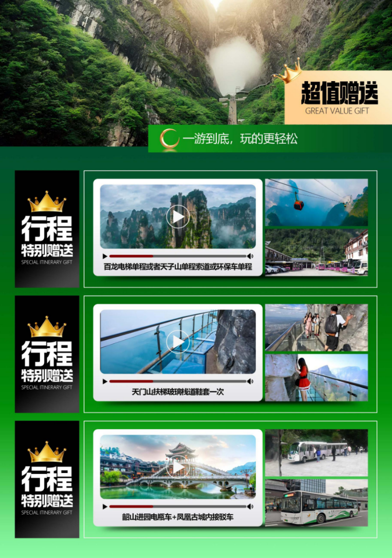 1.为避免严重排队我们选择错峰上下山,百龙电梯往返或者杨家界索道往返或环保车上电梯下、根据实际情况安排,费用已含。