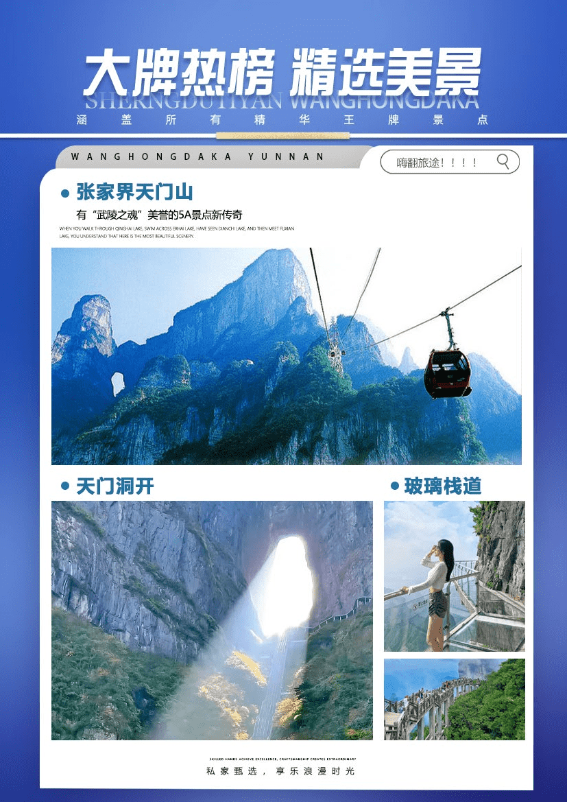 早餐后浏览【世界第一玻璃桥—云天渡】(已含门票),乘车抵达山顶后,感受全球最长最高的玻璃桥,云天渡玻璃桥桥长430米,距谷底约400米,宽6米,全部采用99块透明玻璃铺设而成。仰望蓝天白云,俯瞰溪流潺潺,似漫步云端,超脱尘世,忘却凡间。凭身体承受能力体验首座世界第一长的高山峡谷斜拉玻璃桥奇观,它目前是世界最长、最高的全透明玻璃桥,并创下世界最高最长、首次使用新型复合材料建造桥梁等多项世界之最。