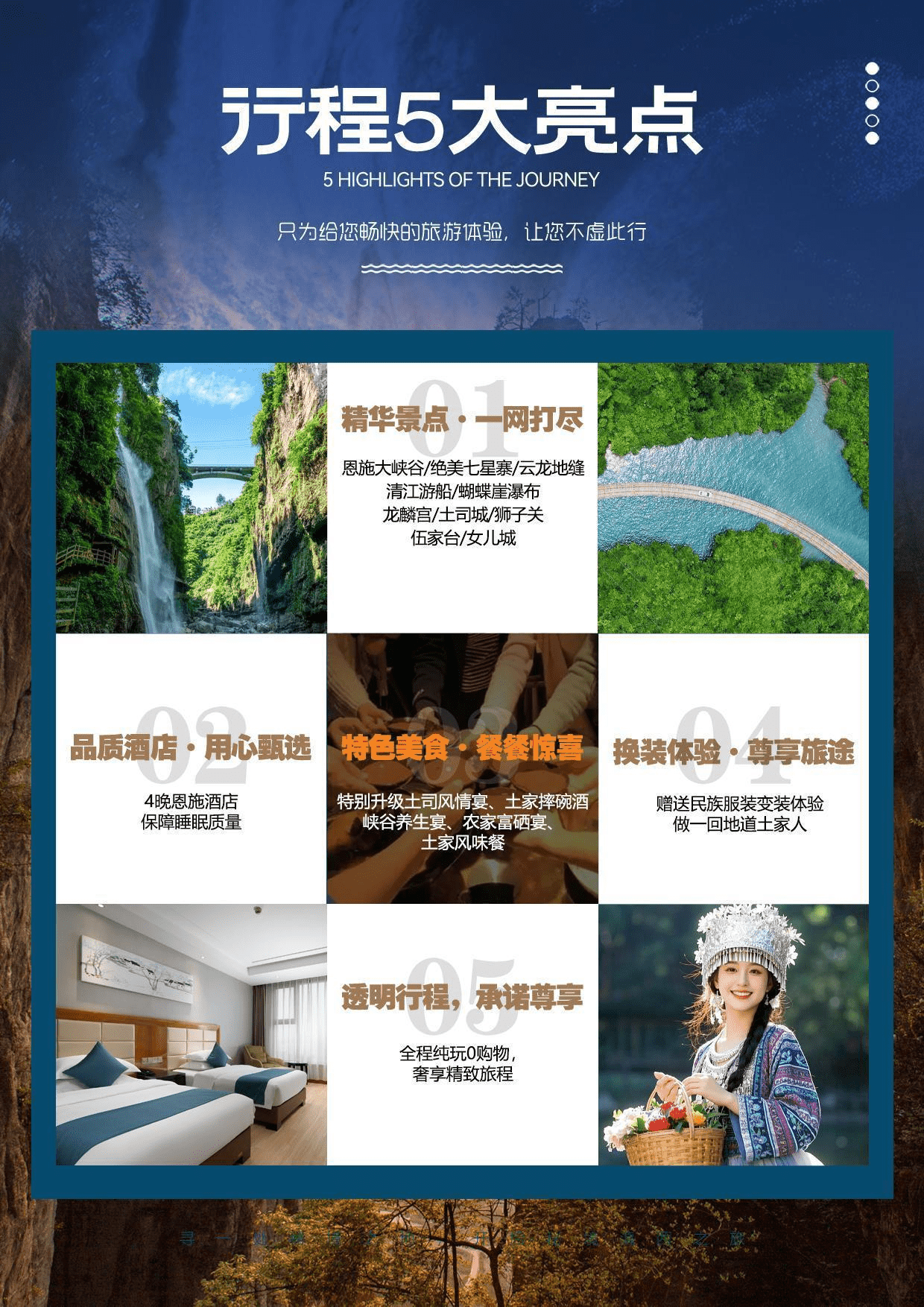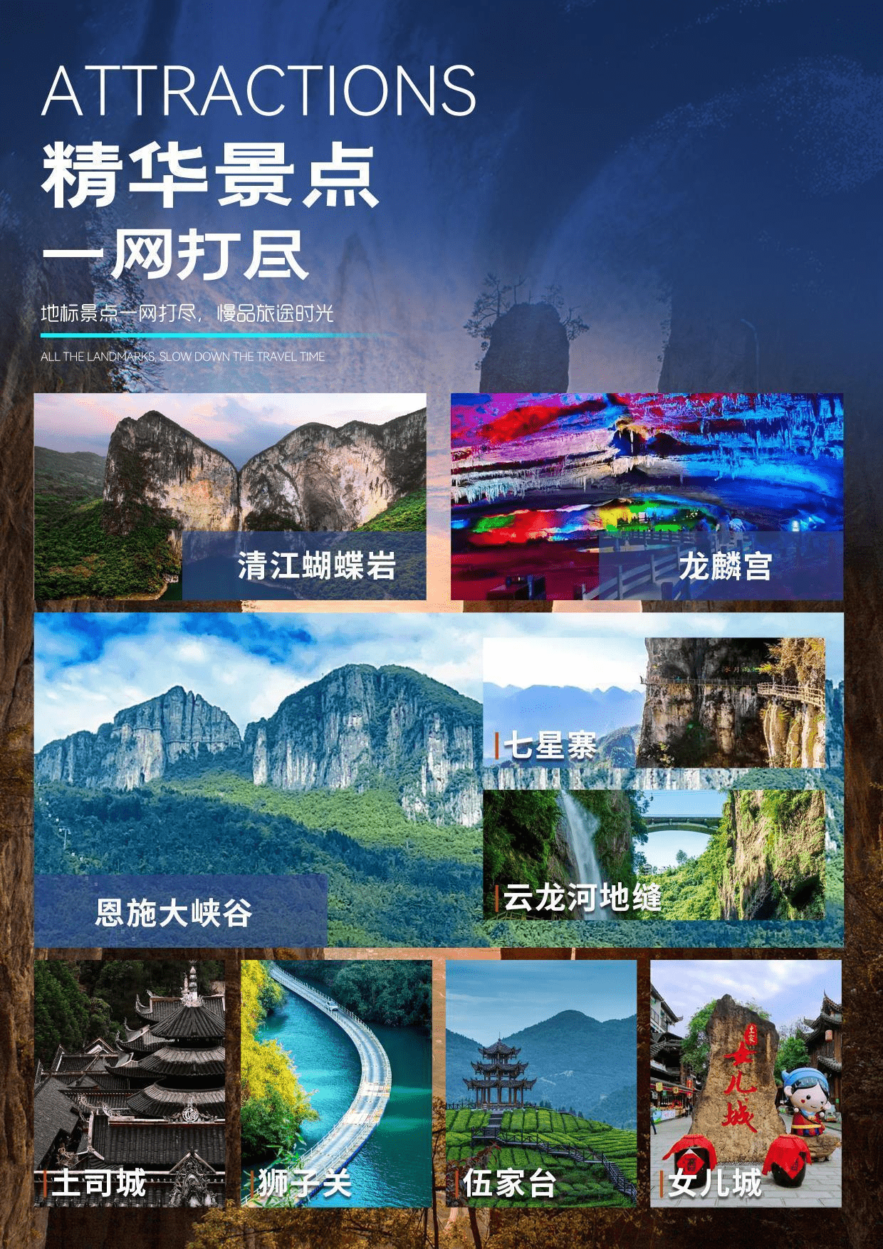 2、精华景点:恩施大峡谷+最美水上公路狮子关+清江蝴蝶岩+伍家台+龙鳞宫+女儿城