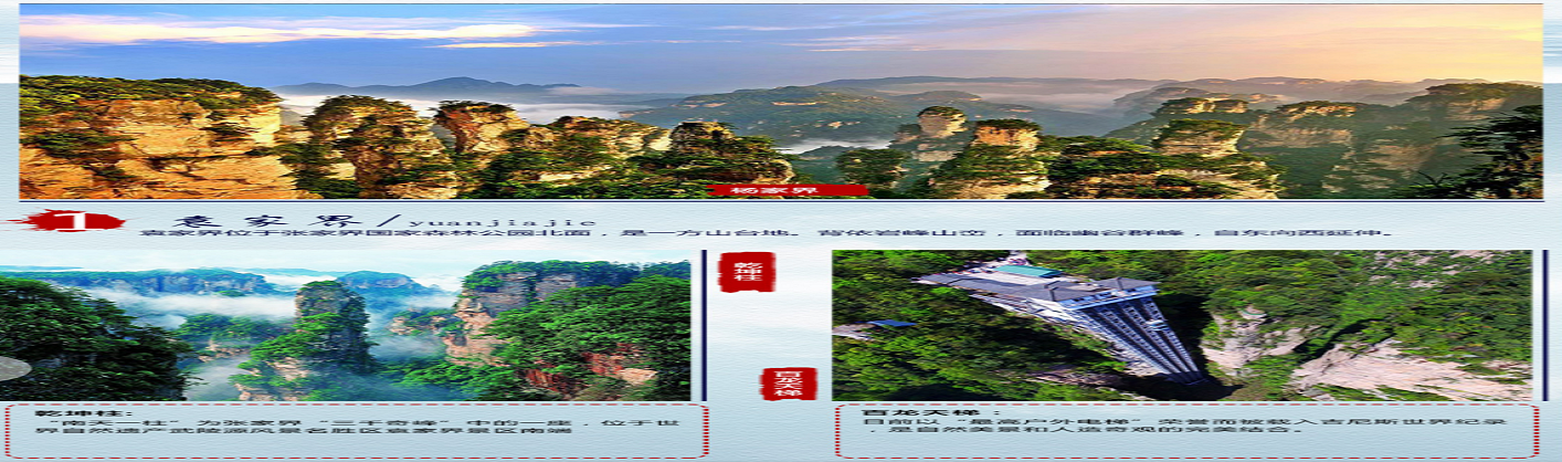 上午:市区集合(以导游通知时间为准)发车前往张家界国家森林公园,从吴家峪(标志门)门票站统一购票,检票乘坐环保车抵达百龙天梯下站。乘坐世界第一梯(百龙天梯),到达袁家界。袁家界,是镶嵌在武陵源核心景区的一颗明珠,也是电影《阿凡达》的外景取景点(哈利路亚悬浮山)。观看的是峰林峡谷地貌,站在袁家界景区的观景台上,三千奇峰尽收眼底,雄险秀野,神态各异。代表景点:迷魂台、乾坤柱、天下第一桥、三观台等