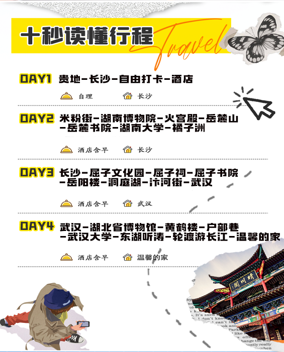 D3 | 长沙Ø屈子文化园Ø屈子祠Ø屈子书院Ø岳阳楼Ø洞庭湖Ø 汴河街Ø武汉 | √ | × | × | 武汉 |