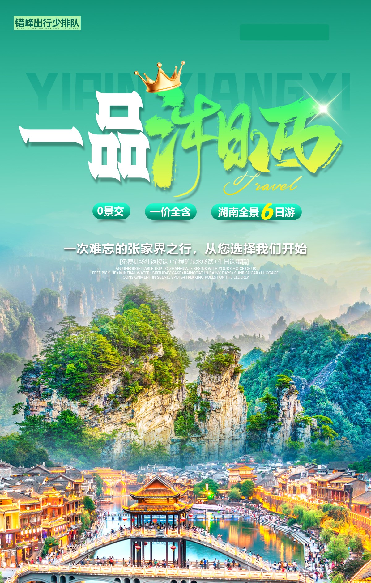 (赠送:百龙天梯单程、天门山扶梯、鞋套,韶山环保车、凤凰接驳车、芙蓉镇、湘西苗寨、土司府城、张家界魅力湘西表演/千古情 所有景点无优无免无退费)