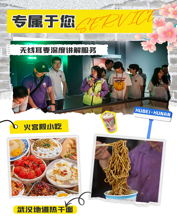 2. 景区门票:所列景区首道大门票,景区内小交通不含(环保车/索道/电瓶车等)。湖南博物院周一闭馆,改为游览长沙简牍博物馆;湖北省博物馆周一闭馆,改为参观昙华林。如遇其他景区/景点闭馆无法参观,亦不添加其他景点,也不做任何赔付。无线耳麦为赠送项目,如遇无线耳麦设备检修无法使用,无费用可退,也不做任何赔付。