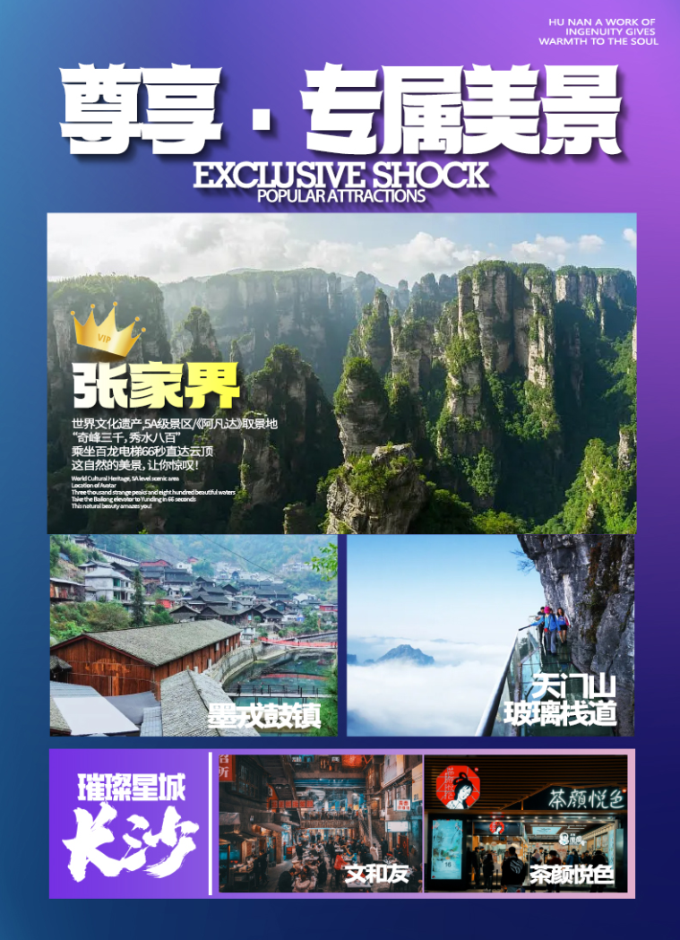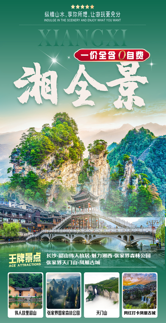 (赠送:百龙天梯单程、天门山扶梯、鞋套,韶山环保车、凤凰接驳车、湘西苗寨、土司府城、张家界魅力湘西表演/千古情 所有景点无优无免无退费)