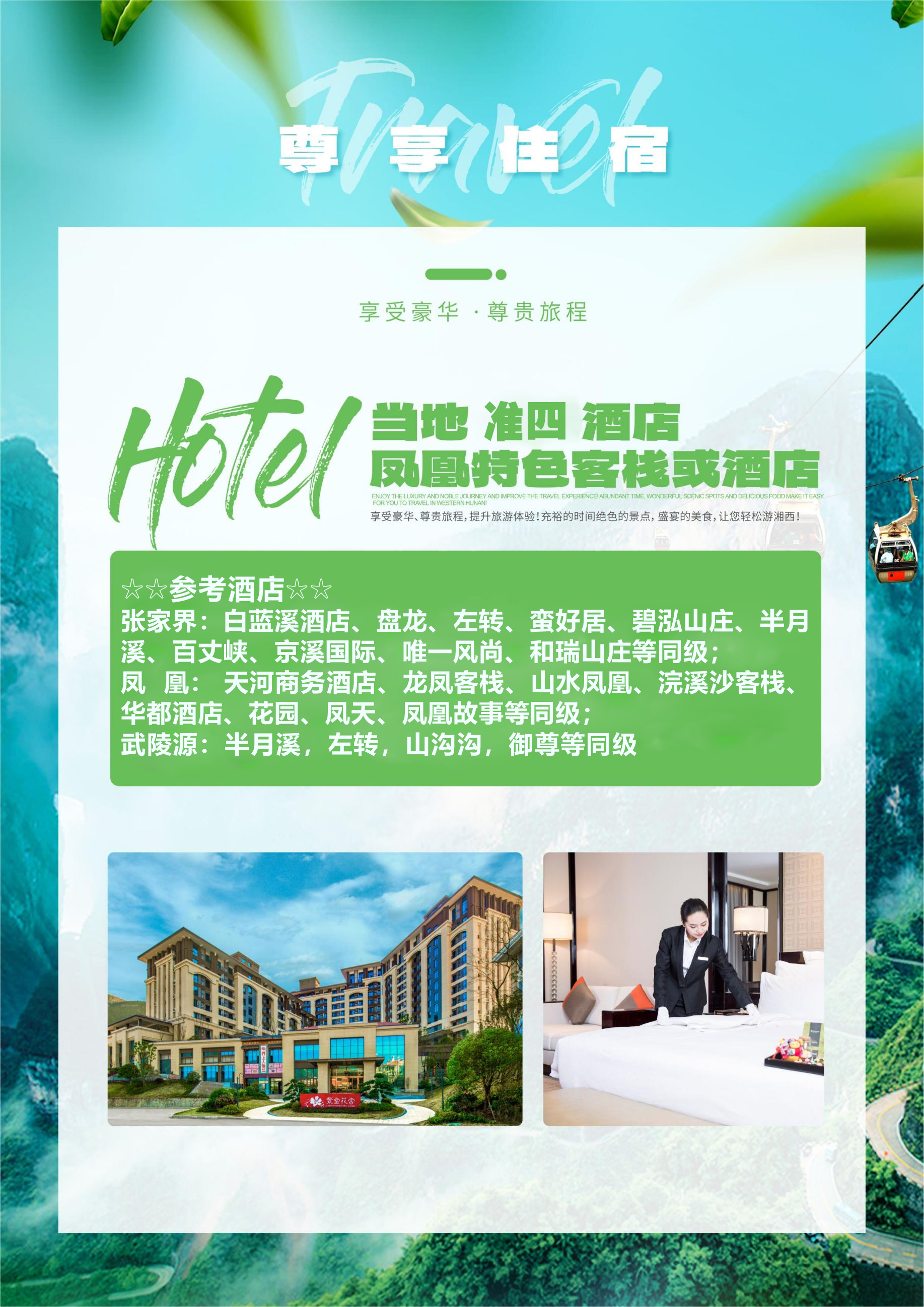 凤 凰:红鸿主题大酒店、河岸假日、栢景朗廷、澜庭客栈、怡佳客栈、嘉熙客栈等或者安排同级酒店;自然单间请补单房差;酒店白天不开空调;