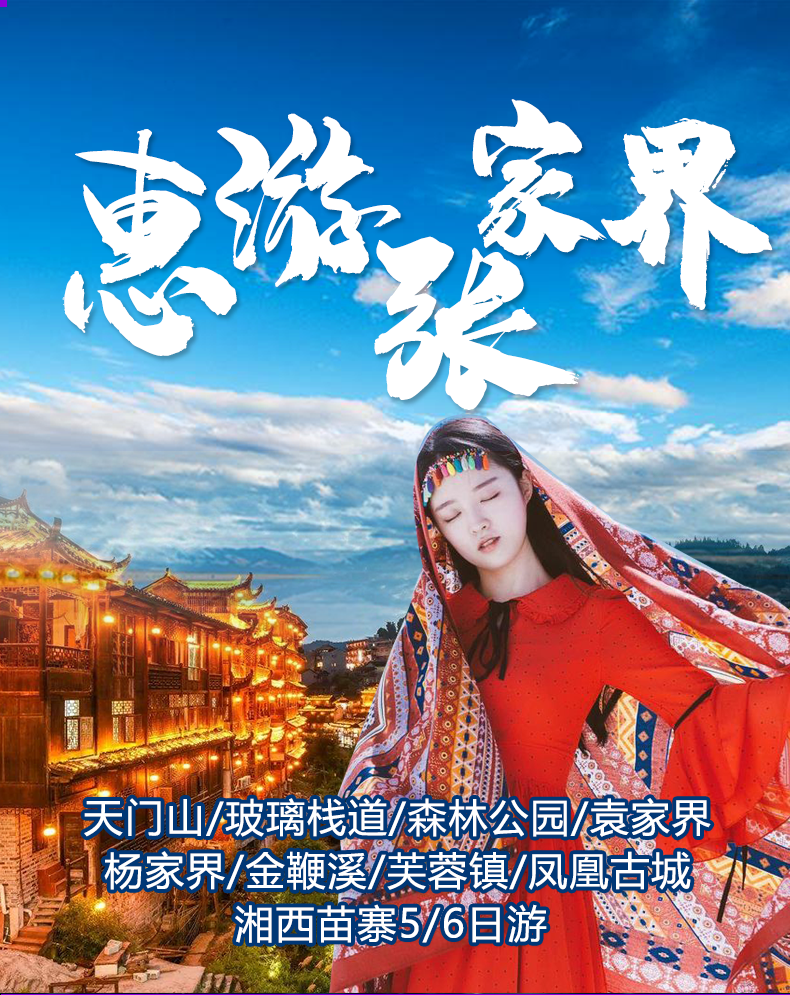 张家界景区环保车+百龙电梯+天门山大索道及扶梯及鞋套+魅力湘西表演=599元/人 (必须消费无优免,现付给导游)