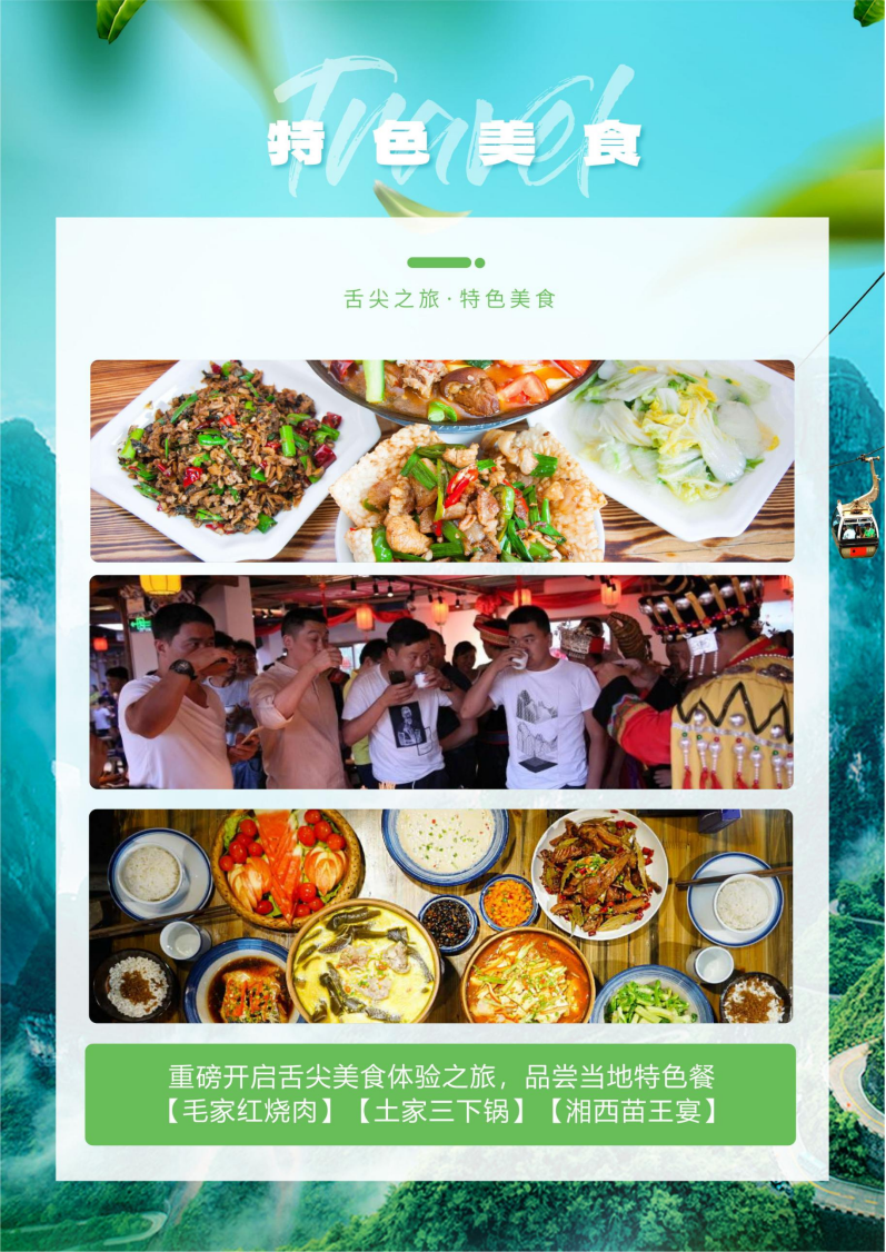 3. 用餐:全程含5早5正餐,正餐30元/餐/人,十人每桌,九菜一汤,正餐不用不退费亦不作等价交换。赠送3个特色餐:韶山主席宴+土家三下锅+土家特色大碗饭+湘西长龙宴+土家赶年宴(根据实际行程时间任意3个)!