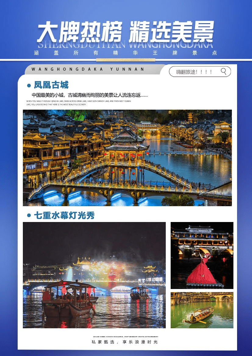 沿河两岸观【七重水幕灯光秀】:苗寨初识、红装姑娘、古城晨光、百米画卷、穿越虹桥、苗成情书、太阳古神;每一重都是苗族的风土人情与国风元素光影科技的融合,令人流连忘返。(如遇堵车、沱江水位过高或过低,大风暴雨等恶劣天气及特殊原因会停演不能正常观看,赠送项目不看不退,也不做等价交换请谅解)。
