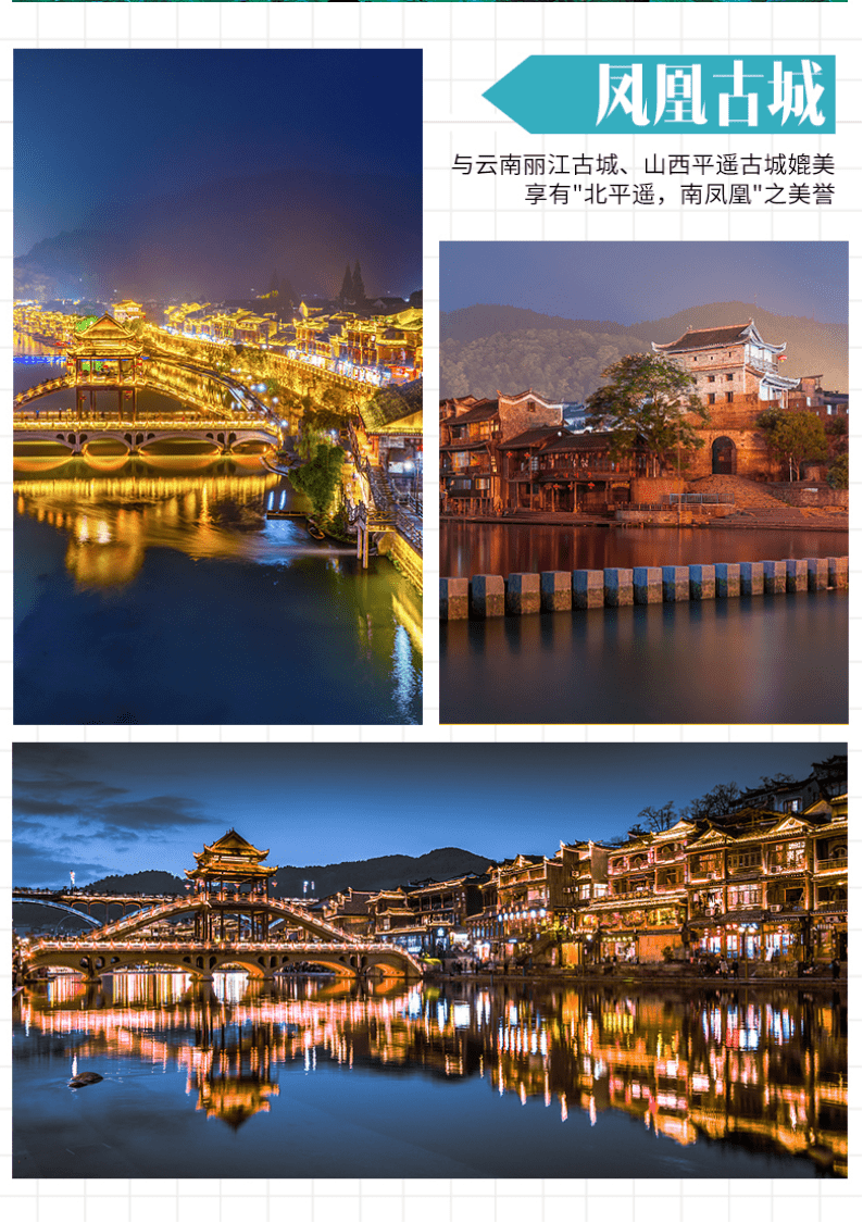 前往凤凰。游览曾被新西兰著名作家路易艾黎称赞为中国最美丽的小城--【凤凰古城AAAAA,不含门票】凤凰历史悠久、经历沧桑的风雨桥。同时也可以了解凤凰的风水宝地,感受清明时期的建筑设施,了解先辈们的文化之精髓,感受朱镕基总理的亲笔题字,之后沿沱江两岸漫步、欣赏悠悠沱江水,翩翩吊脚楼,漫步凤凰古城民族风情工艺品一条街,在古城内可免费品尝着沁人心脾的苗家姜糖,深入了解中国非物质文化遗产-----苗银纯手工锻造技艺;一种远离尘世的感觉悠然而生;一幅江南水乡的画面便展现于眼前,这一切都使人留连忘返让您回味无穷。