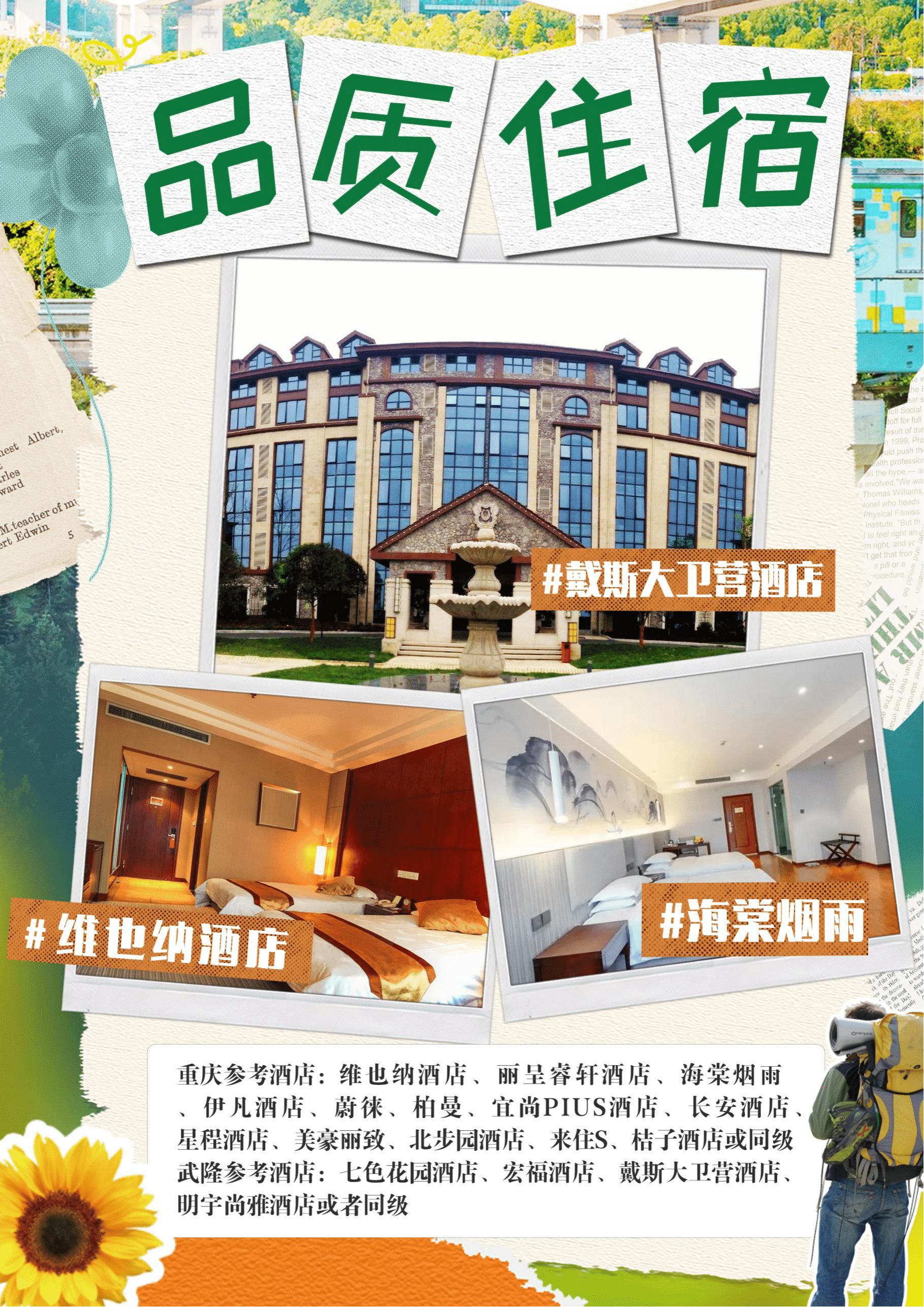 武隆参考酒店:七色花园、大卫营酒店、云海酒店、荣融金科大酒店、城际酒店、宏福酒店、瑜珠花园酒店、迩之安酒店、明宇尚雅酒店或同级