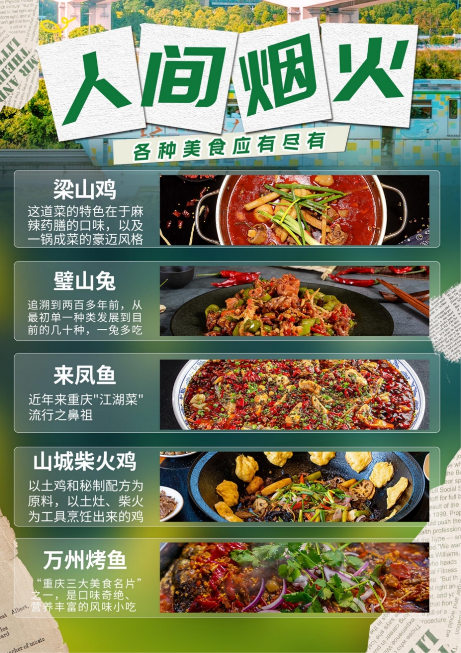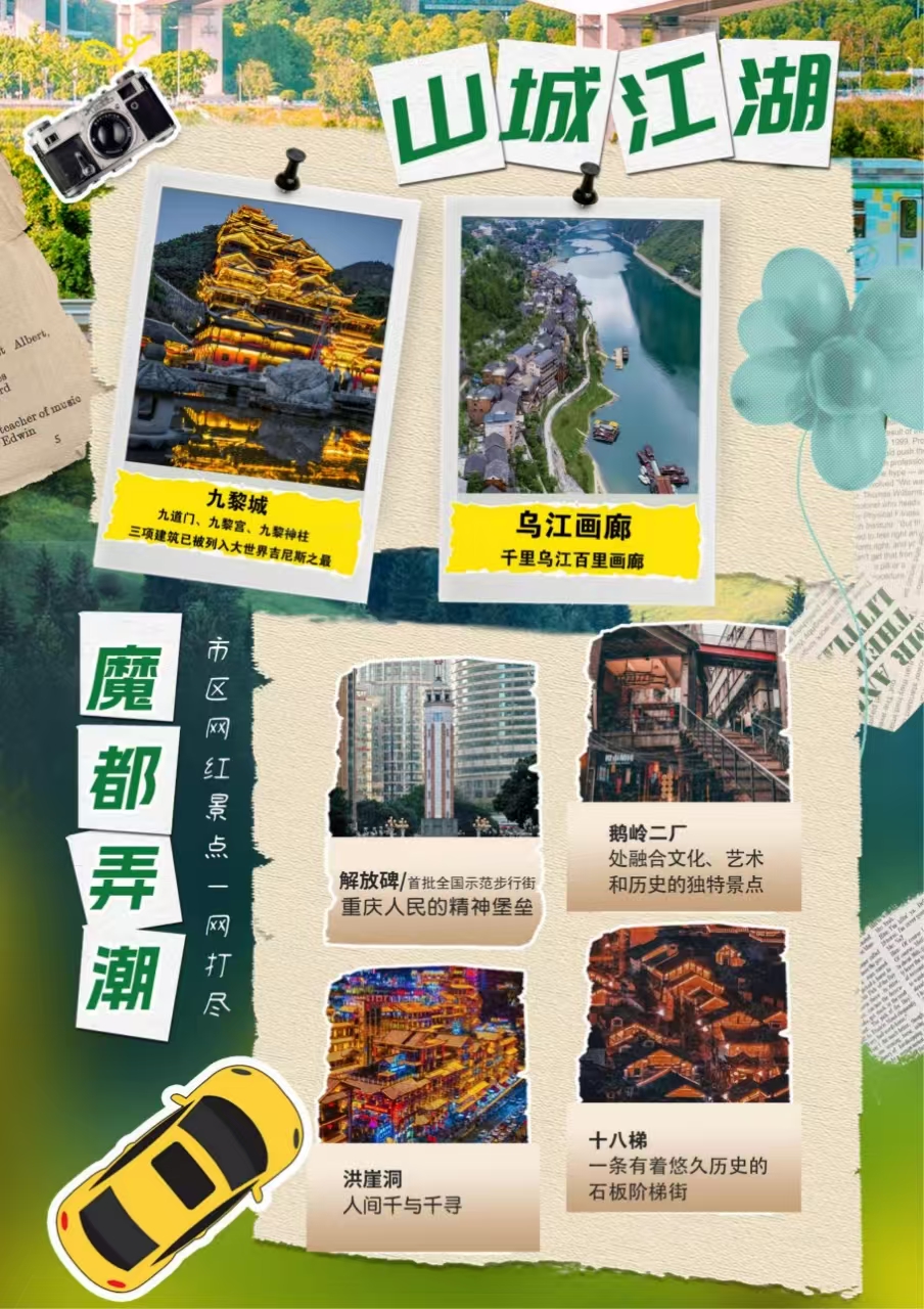 龙门浩·下浩里、第三步道、十八梯古镇、解放碑、洪崖洞、磁器口。