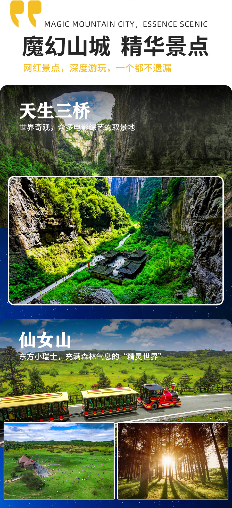 ①景区内交通:天生三桥电瓶车15和仙女山小火车25(自愿自理)