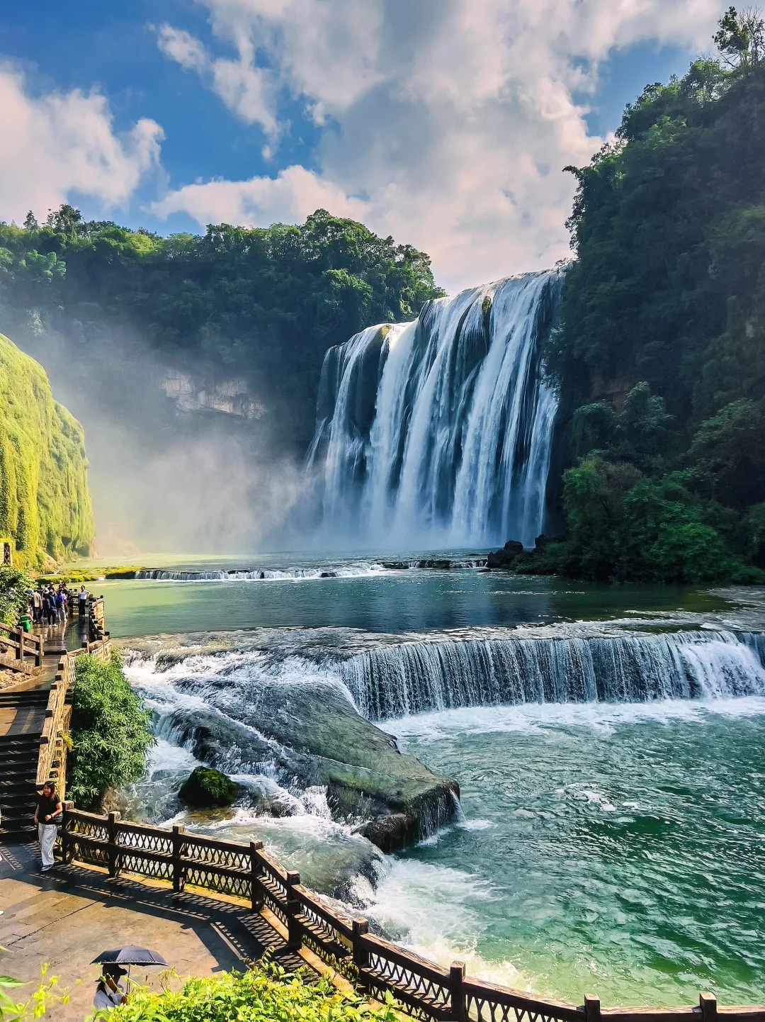 早餐后乘车前往安顺国家AAAAA级景区——【黄果树大瀑布】---世界著名大瀑布之一,以水势浩大著称。瀑布高度为77.8米,宽101米,也是亚洲第一大瀑布,可以从上、下、前、后、左、右、里、外八个方位观赏。每当水量充沛时,黄果树瀑布便如银河倾泻,水声震耳欲聋,气势磅礴,令人叹为观止。【陡坡塘瀑布】平水时,水流清澈,瀑布水层沿着和缓的瀑面,均匀地撒开,如一层薄薄的、半透明的面纱,又如一面面张开的素绢扇面,在阳光下泛着银光,故有人戏称为“新娘面纱”,这里也是《西游记》中唐僧师徒四人牵马过河的取景地。【天星桥半程】脚踏在石上,人行在水中,小桥流水,曲径通幽,这里溶汇了喀斯特地貌的精华,集山、水、林、洞、根、滕、石、瀑为一体。蕴含了世界上每个人生日的数生步,自然形成宛如美女的根抱石景观,风刀水剑刻就的万顷盆景,根笔藤墨绘帛的千古绝画,带您领略大自然的鬼斧神工。