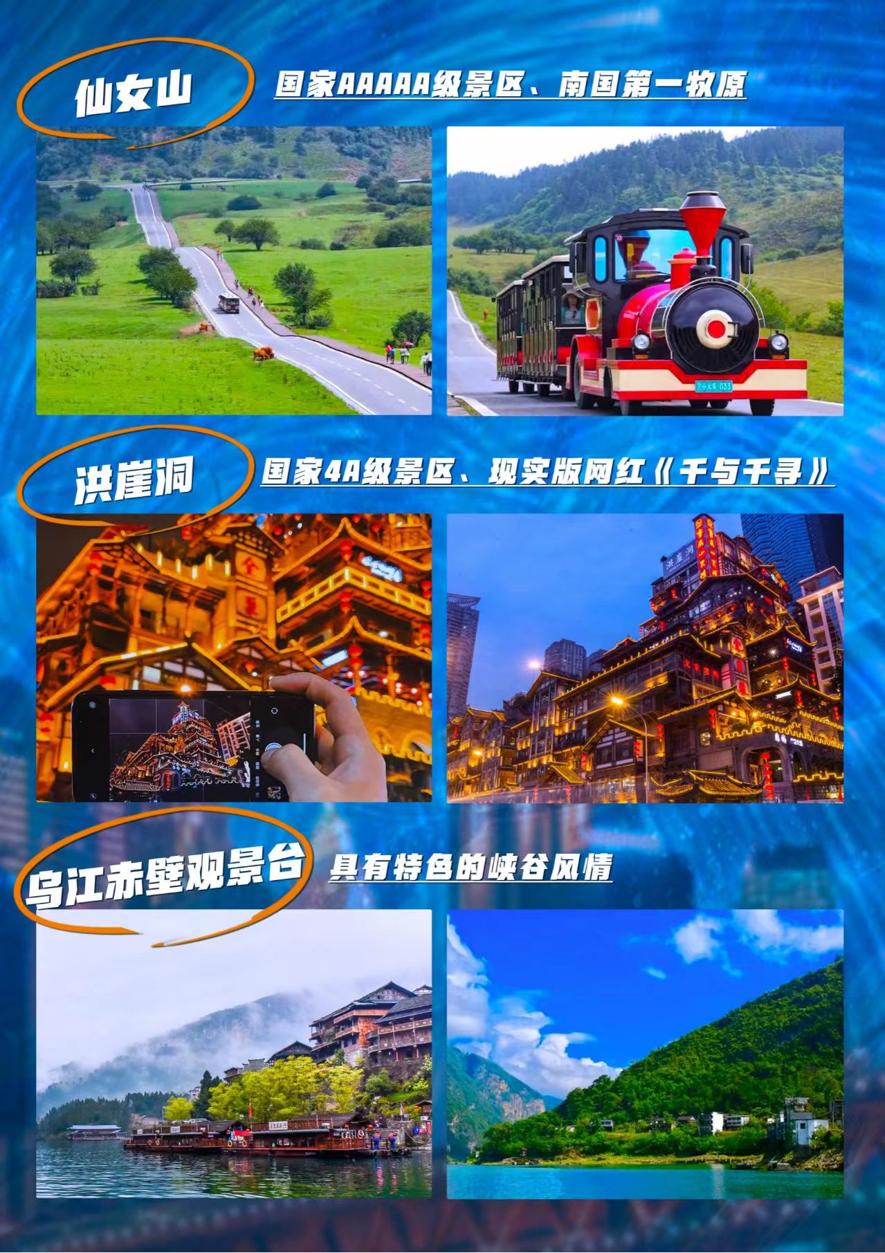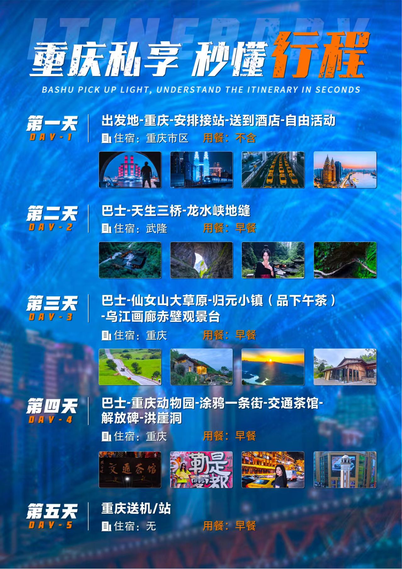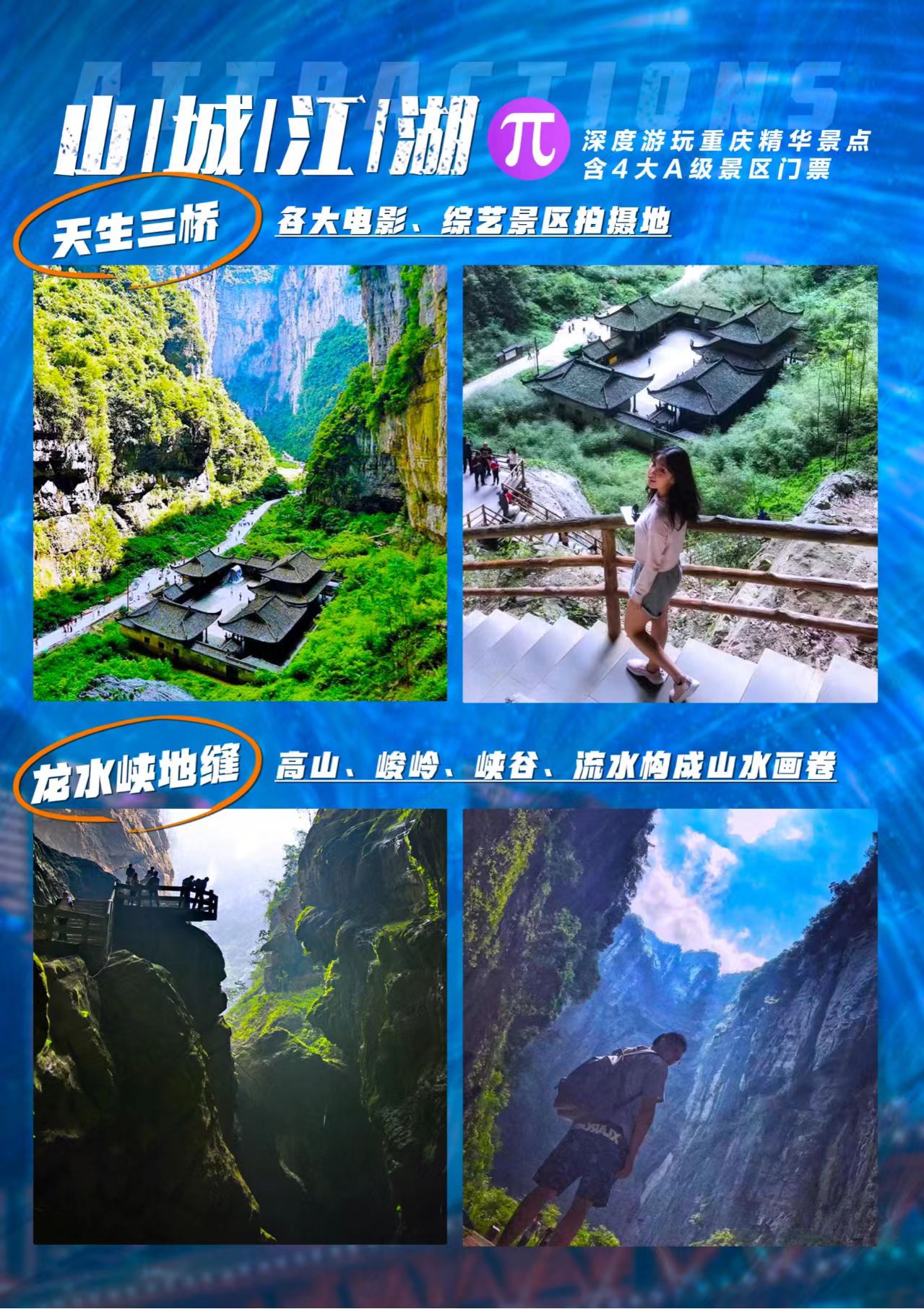 【优选景点】乌江画廊赤壁观景台、武隆天生三硚、龙水峡地缝、仙女山、归元小镇(品下午茶)、乌江画廊赤壁观景台、重庆动物园、涂鸦一条街、交通茶馆、解放碑、洪崖洞