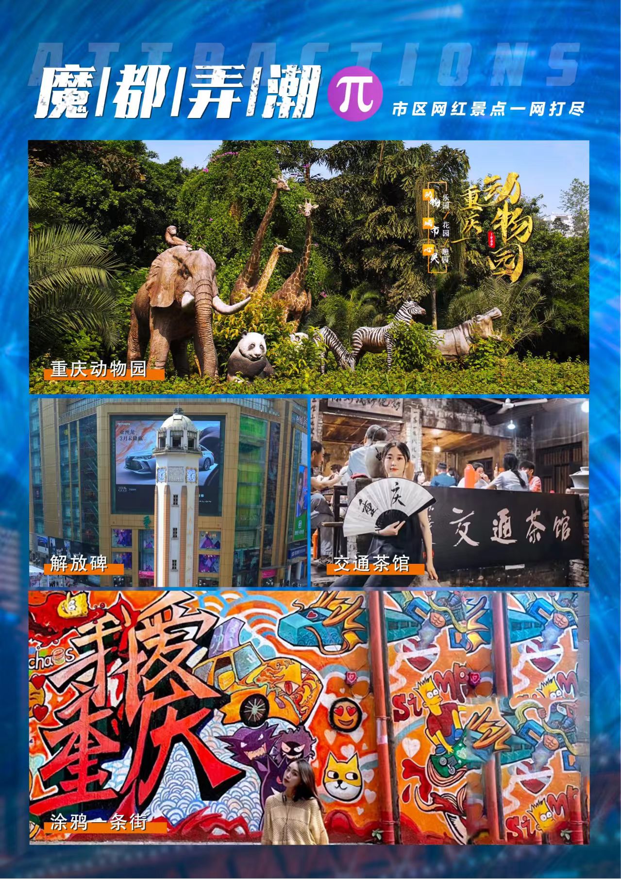 D4 | 重庆动物园-涂鸦一条街-交通茶馆-解放碑-洪崖洞 | √ | × | × | 重庆 |