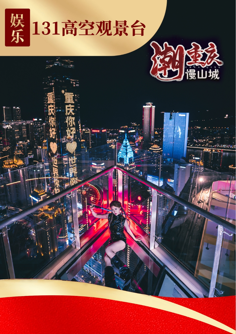 131高空观景台:(自费158元/人)重庆天台 131 高空观景台位于渝中区邹容路 131 号世贸大厦 56 层至天台,海拔 262 米。这里是俯瞰两江四岸、体验 8D 立体重庆的绝佳窗口,可 360° 观赏解放碑商圈、千厮门大桥等美景。乘坐总高 211.9 米的亚洲最长写字楼外挂观光电梯,85 秒即可直达 56 层。观景台还设有粉色芭比主题区、红砖墙复古角等特色打卡点。