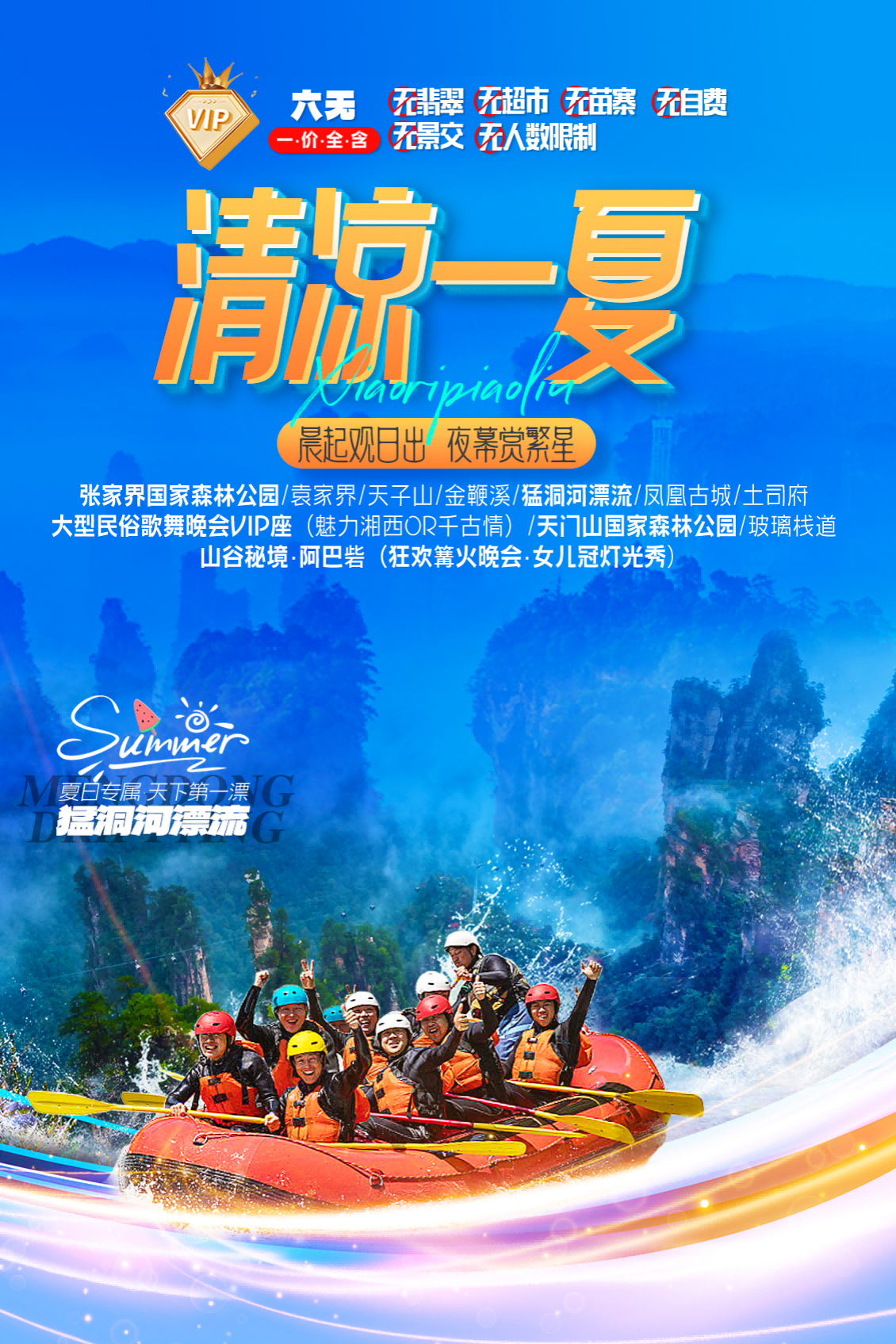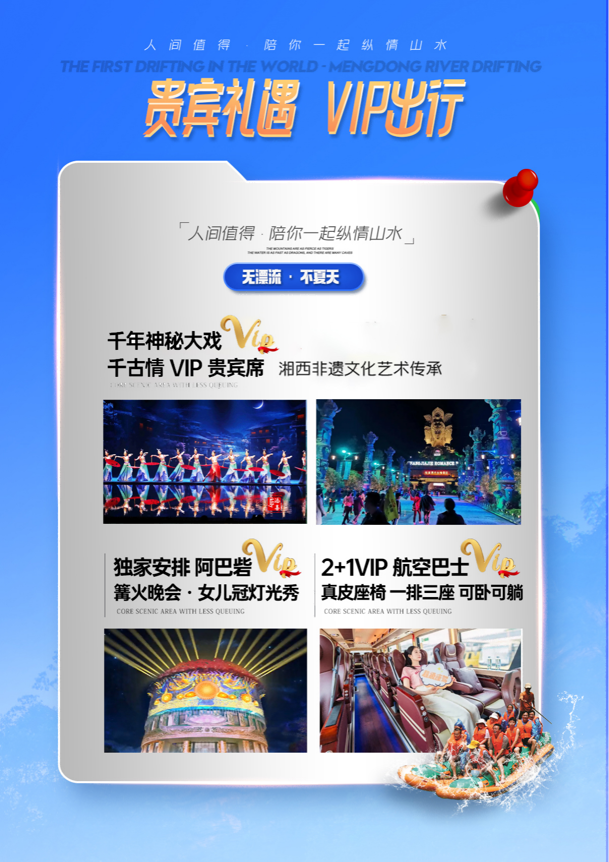 1、门票:张家界国家森林公园门票+百龙电梯单程+猛洞河漂流+大型民俗歌舞晚会VIP座(魅力湘西OR千古情)+凤凰古城接驳车+天门山国家森林公园+土司府+阿巴砦;