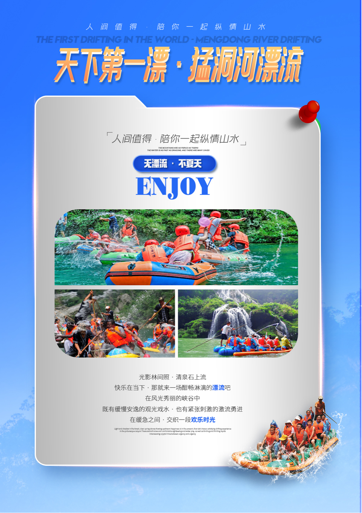 后中餐后,赴有“三峡之美、桂林之秀、西湖之温馨”美誉的【猛洞河漂流】:乘着有船工掌舵的橡皮舟在原生态大峡谷,一路是古老的河道,绝壁百里,怪石嶙峋,滩奇水异,两岸苍翠的林木,云雾缭绕,飞瀑流泉与溶岩峰林交相辉映,翻卷奔腾的巨浪急流,时而把皮艇推向高高的浪尖,时而又跌落深深的谷底,博浪击水,俯仰起落,在十三浪、鸡笼门、阎王滩、小阎王滩等一道道浪,一重重滩中曲折回旋,沐浪浴涛,拐一百五十五个弯,在一百三十三个滩潭中穿梭而行,迂回流连,驰魂奔魄,心旷神怡,真切地享受一种难以言传的惊险与惊喜,浪漫与刺激,让您切实感受“天下第一漂”。