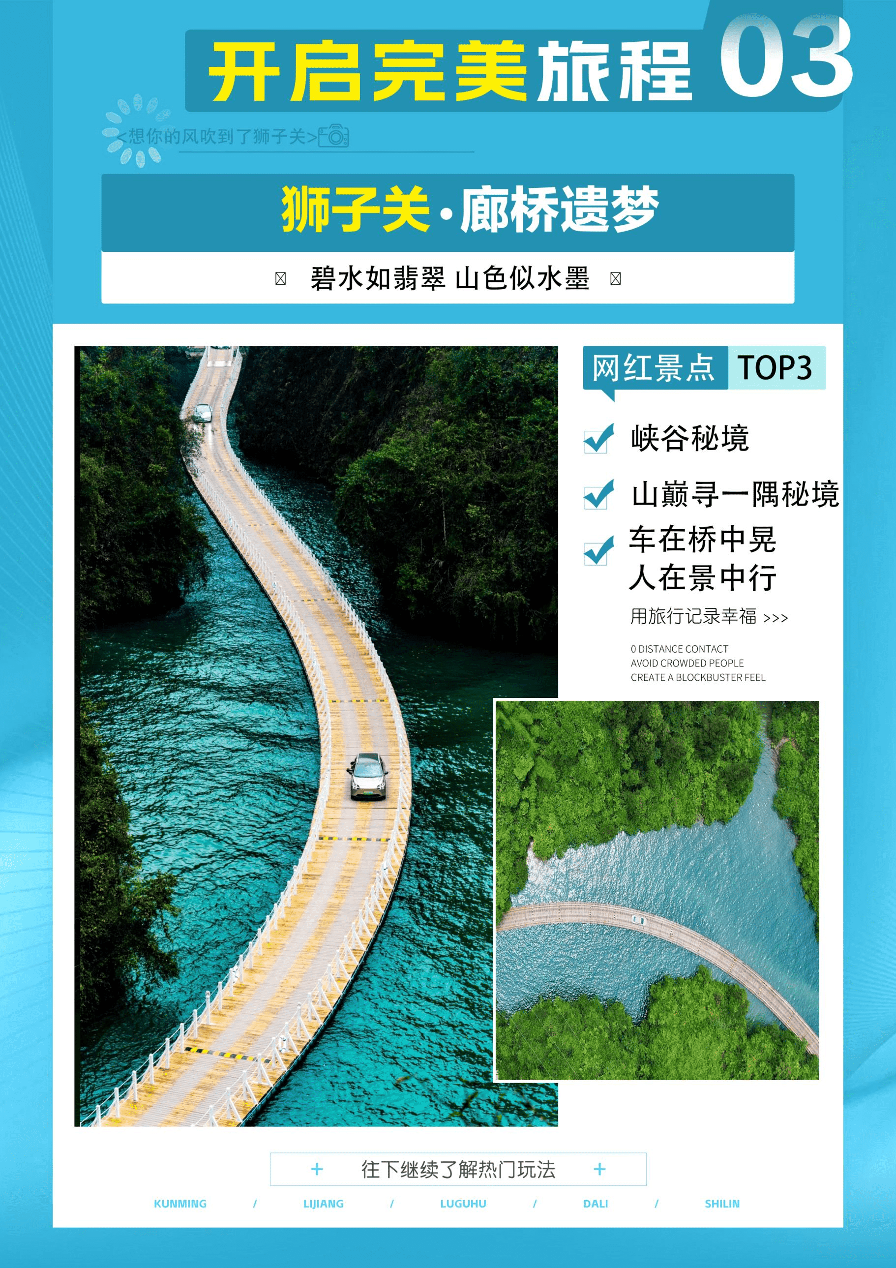 早餐后乘车前往宣恩县【狮子关】(车程约1.5小时,游玩时间约2-3小时)狮子关有大小岩山五座,山形状似狮子,所以叫狮子关。景区大门后几百米,就下到了水上栈道(俗称浮桥)的中段的高处,也是拍摄浮桥全景的地方。我没有像其他游客那样乘坐旅游车,直接沿公路到了水上栈道的另一端,然后再下到浮桥。从此地俯瞰下去,整条河流呈现出一道半圆弧+S形走向,就像镶嵌在两座山峰之中的绿宝石,弯弯曲曲地伸向远方,最后消失在视线之外,狮子关的四周都是峡谷,干峡谷风光带和水峡谷风光带,把景区一分为二,森林、流水,形态万千的洞穴,碧绿的水面倒影着山谷,像是一面明镜。为了去摸这一江绿水,真的是太舒服了,整个景点设计的蛮用心。