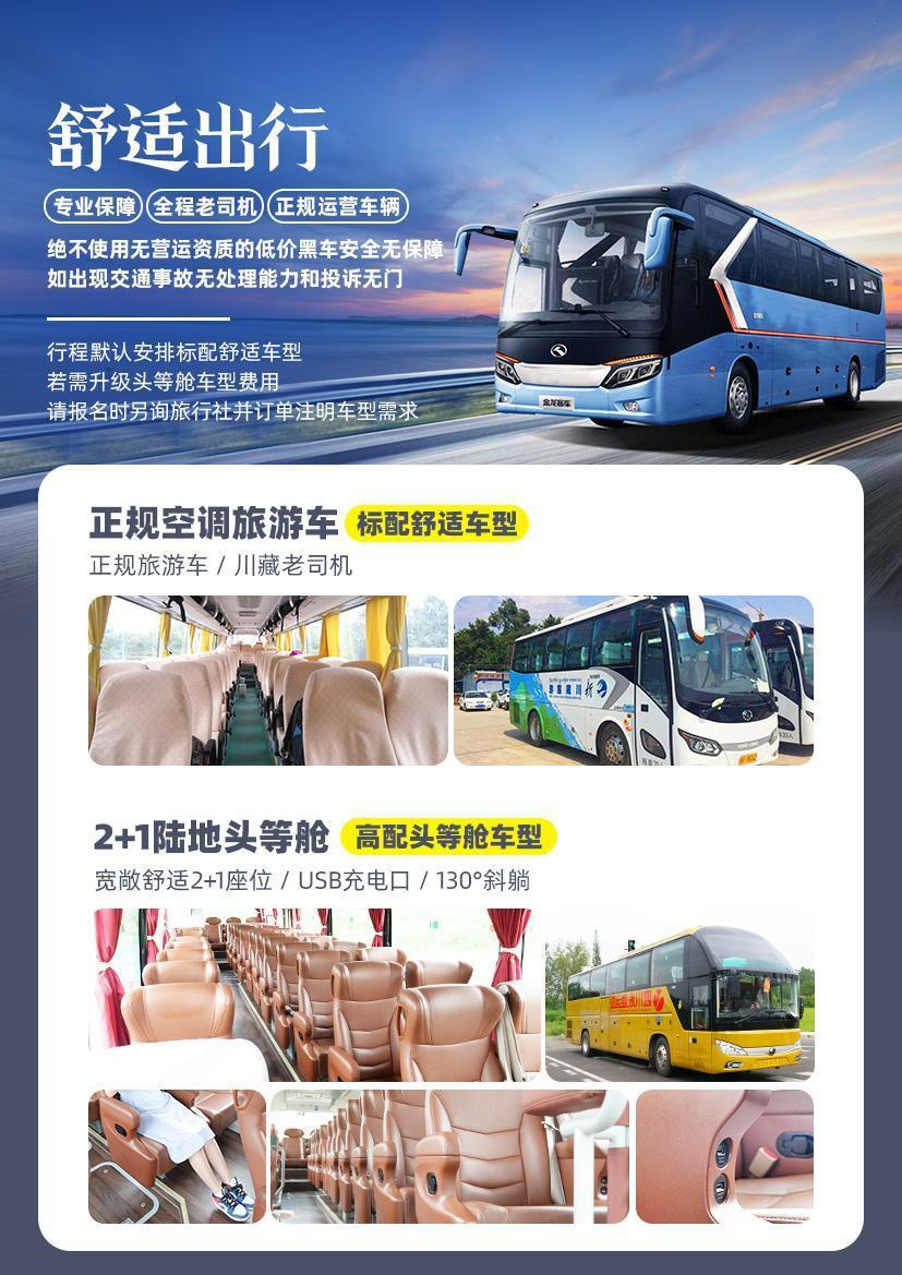 4、交通:当地空调旅游2+1头等舱车,全车配USB充电接口/充电宝,保证每人一正座