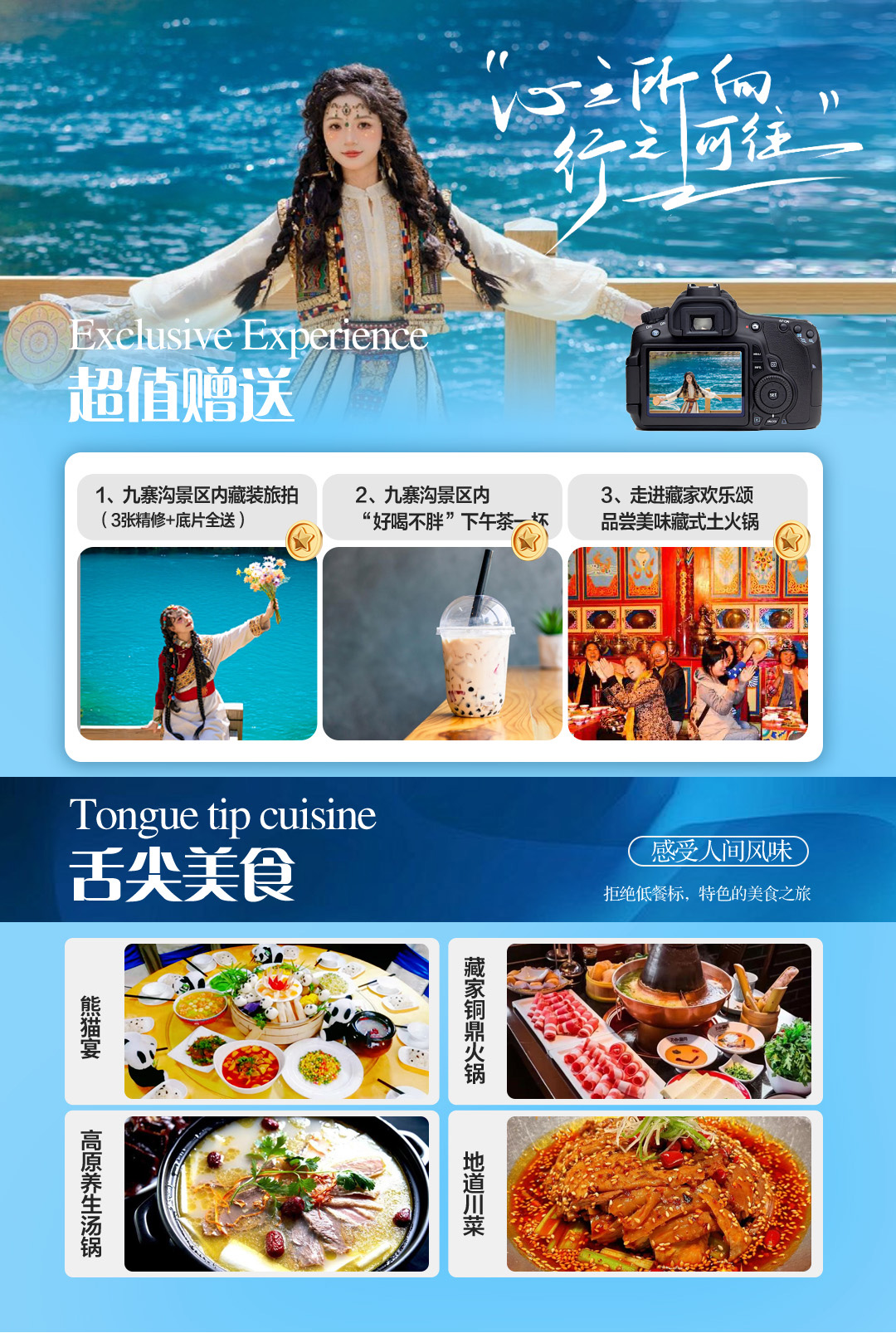 6.赠送九寨沟旅拍和奶茶,若因天气原因或个人原因无法拍摄,费用不退;摄影师提前一天晚上7-9点联系,请注意接听电话,若未接到通知,请及时告知导游
