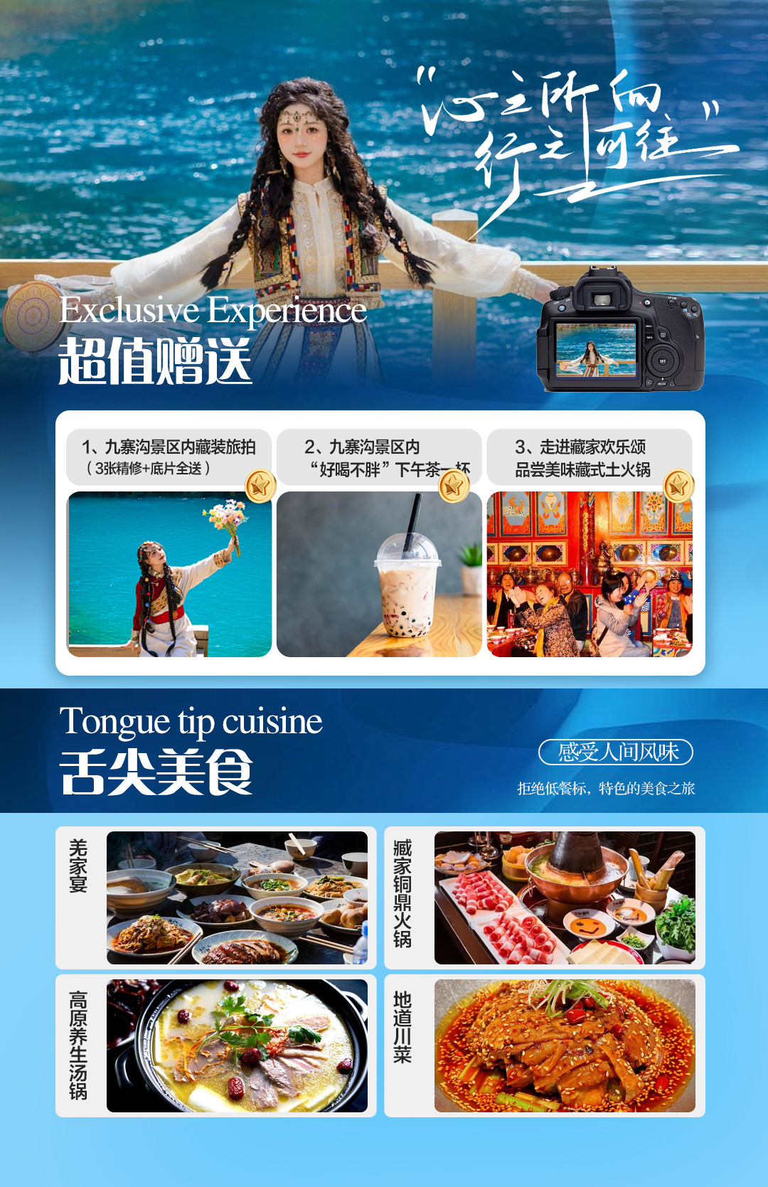 备注:九寨沟景区内旅拍体验+下午茶为我司赠送项目,若取消此礼包,下单之前确认结算价可减30元/人,出行后取消不退任何费用。