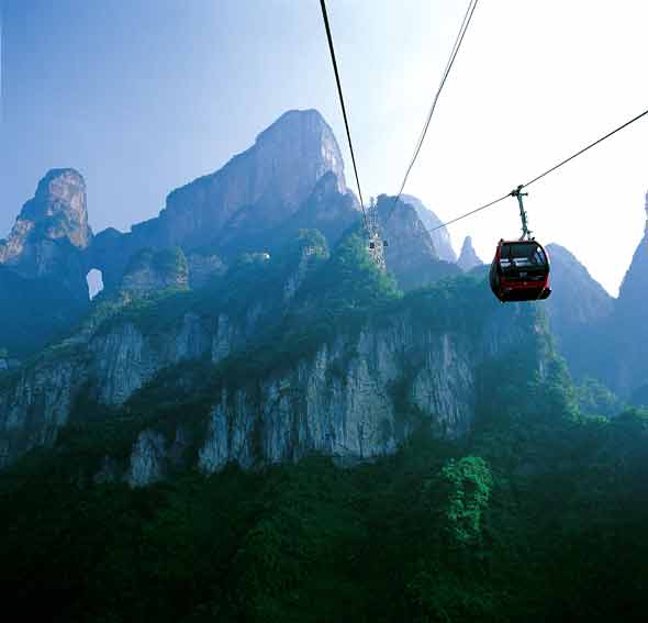 (如遇恶劣天气影响,天门山景区考虑安全因素,部分景点会关闭,以景区实时公布为准,敬 请报名时知须。)【天门山索道】通天大道之外的上下山通道。它是世界最长高山观光客运索道,全长 7454 米,高差 1277 米,单程运行时间约 28 分钟。其中间站到上站之间的局部斜度高达 37 度,世界罕见;