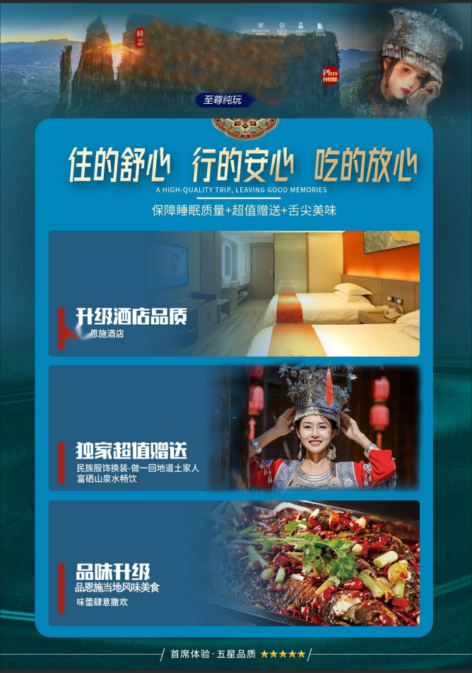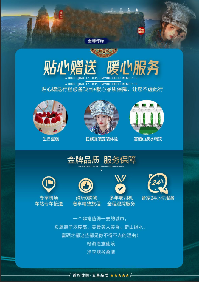 特别安排:换装体验,穿民族服饰、品土苗风情,多种民族服饰可供选择,深度体验土家文化,留下美好记忆!(超值赠送:来恩施必打卡之一【民族服饰换装体验】(每人1套,赠送项目,不体验不退费)