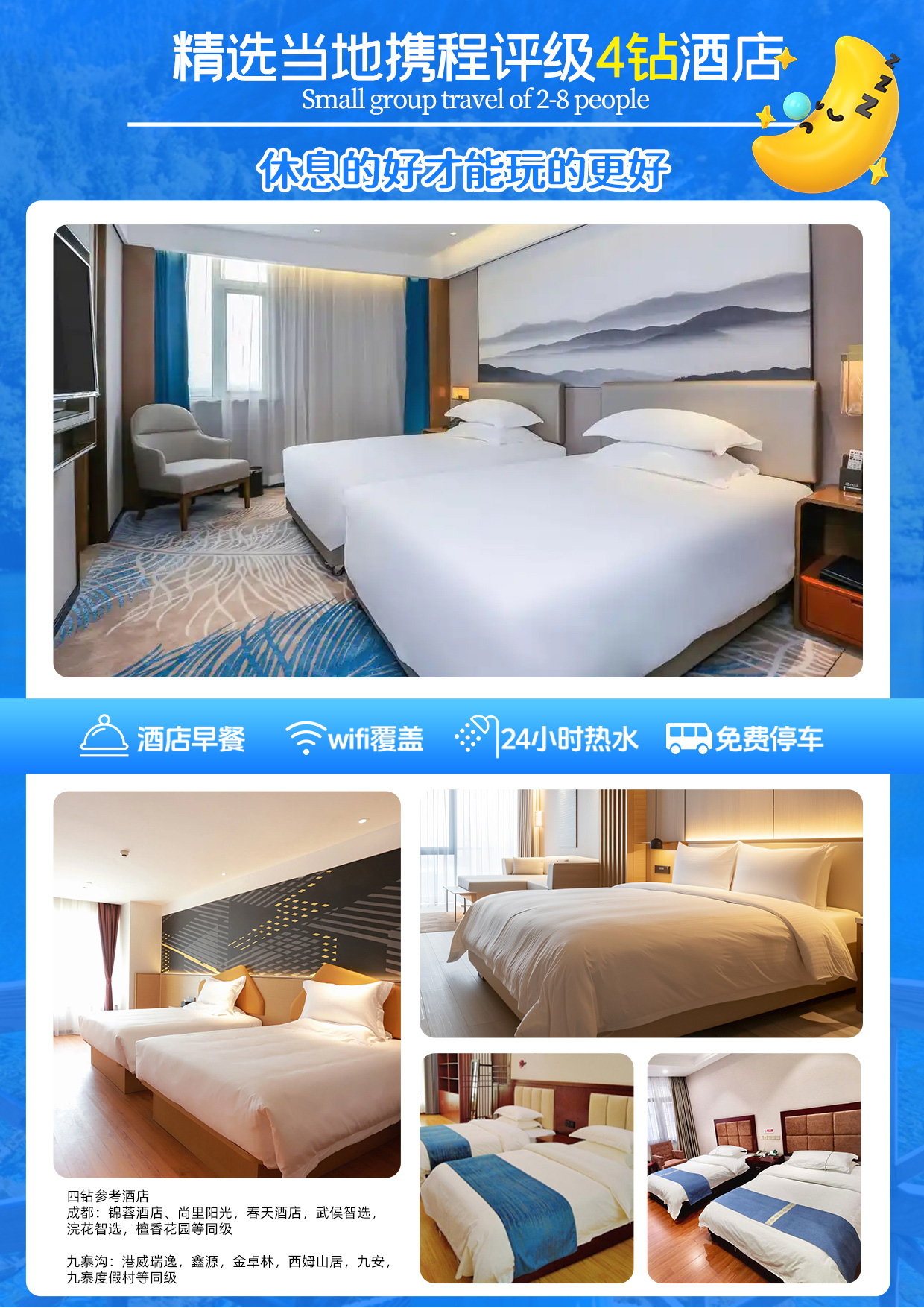 入住当地四钻酒店,全程含早+24h专车统一送站