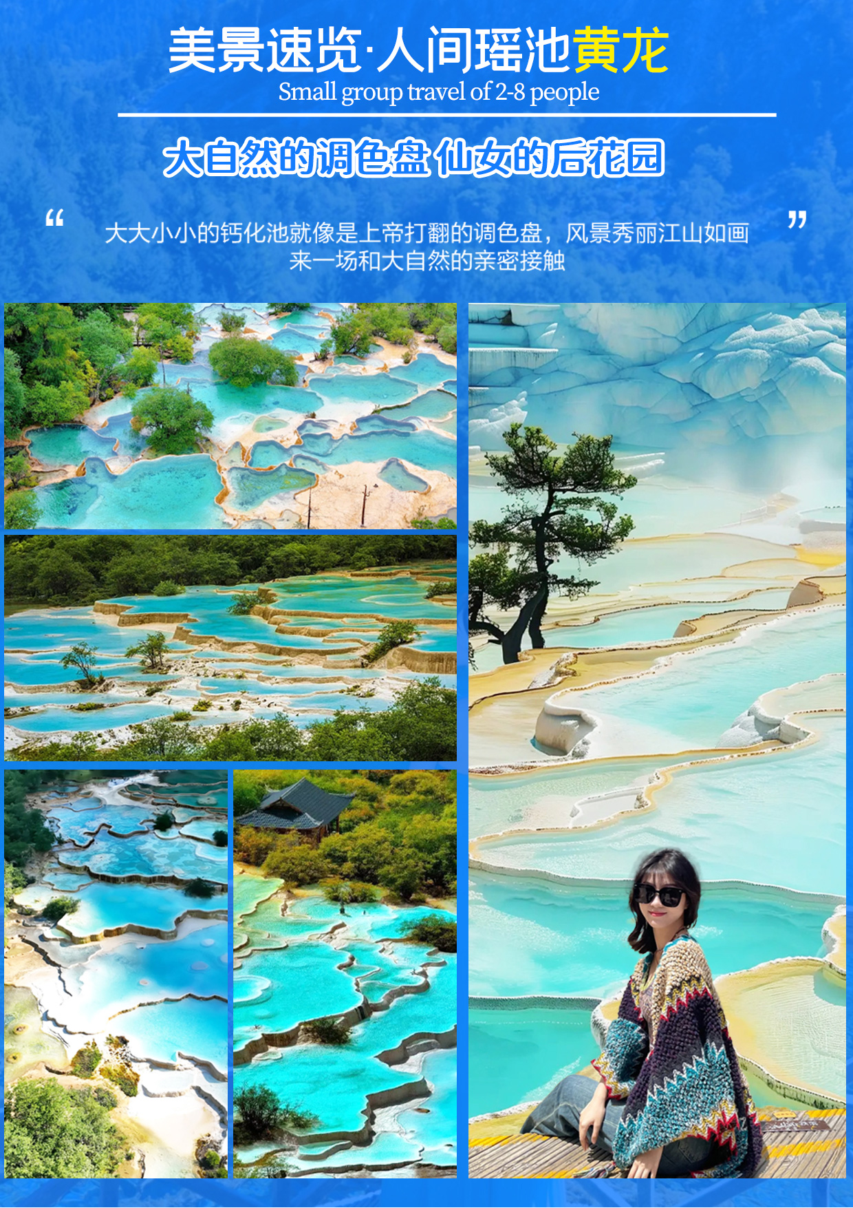 早餐后游览【黄龙风景区】(门票已含,不含索道上行80元下行40元,定位讲解器30元/人,观光车20元/人游览时间约3.5小时)以彩池、雪山、峡谷、森林“四绝”著称于世,再加上滩流、古寺、民俗称为“七绝”。景区由黄龙沟、丹云峡、牟尼沟、雪宝鼎、雪山梁、红星岩,西沟等景区组成。主要景观集中于长约3.6公里的黄龙沟,沟内遍布碳酸钙华沉积,并呈梯田状排列,以丰富的动植物资源享誉人间,享有“世界奇观”“人间瑶池”等美誉。
