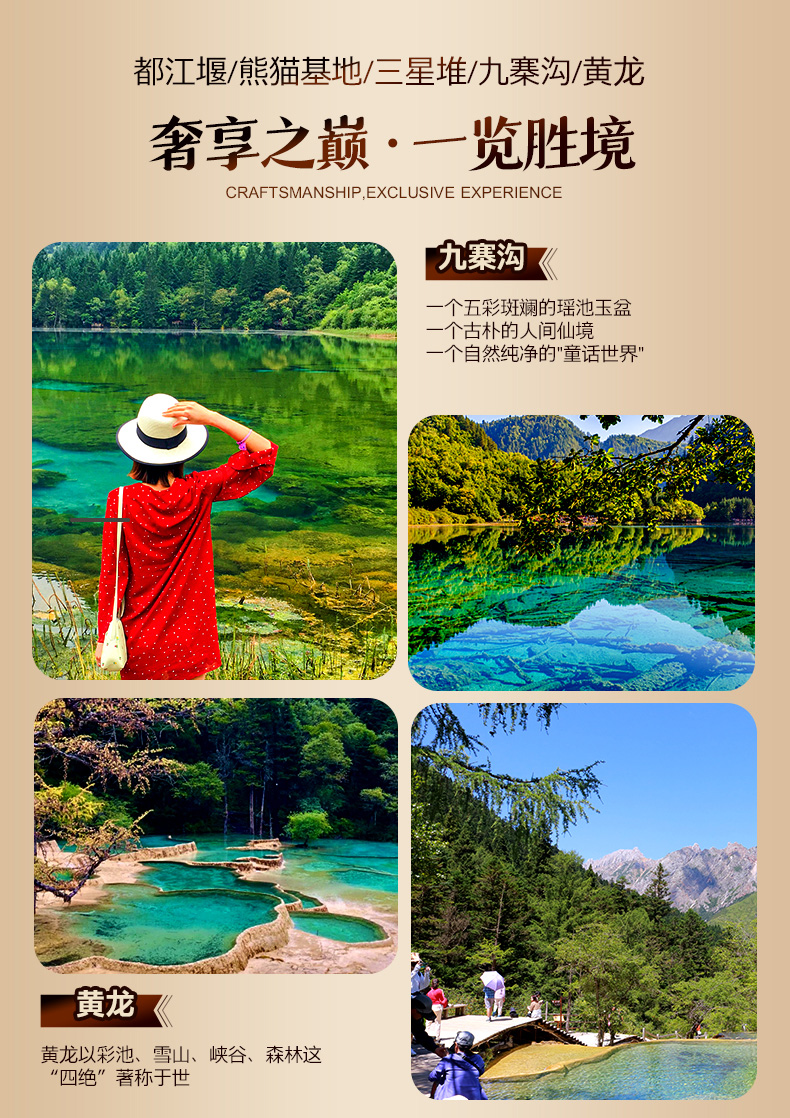1、含景区配套设施及小交通:九寨观光车保险100元,黄龙上索道定位器保险120元,熊猫基地观光车及电子讲解50元/人,都江堰观光车20元/人,讲解耳麦20元/人
