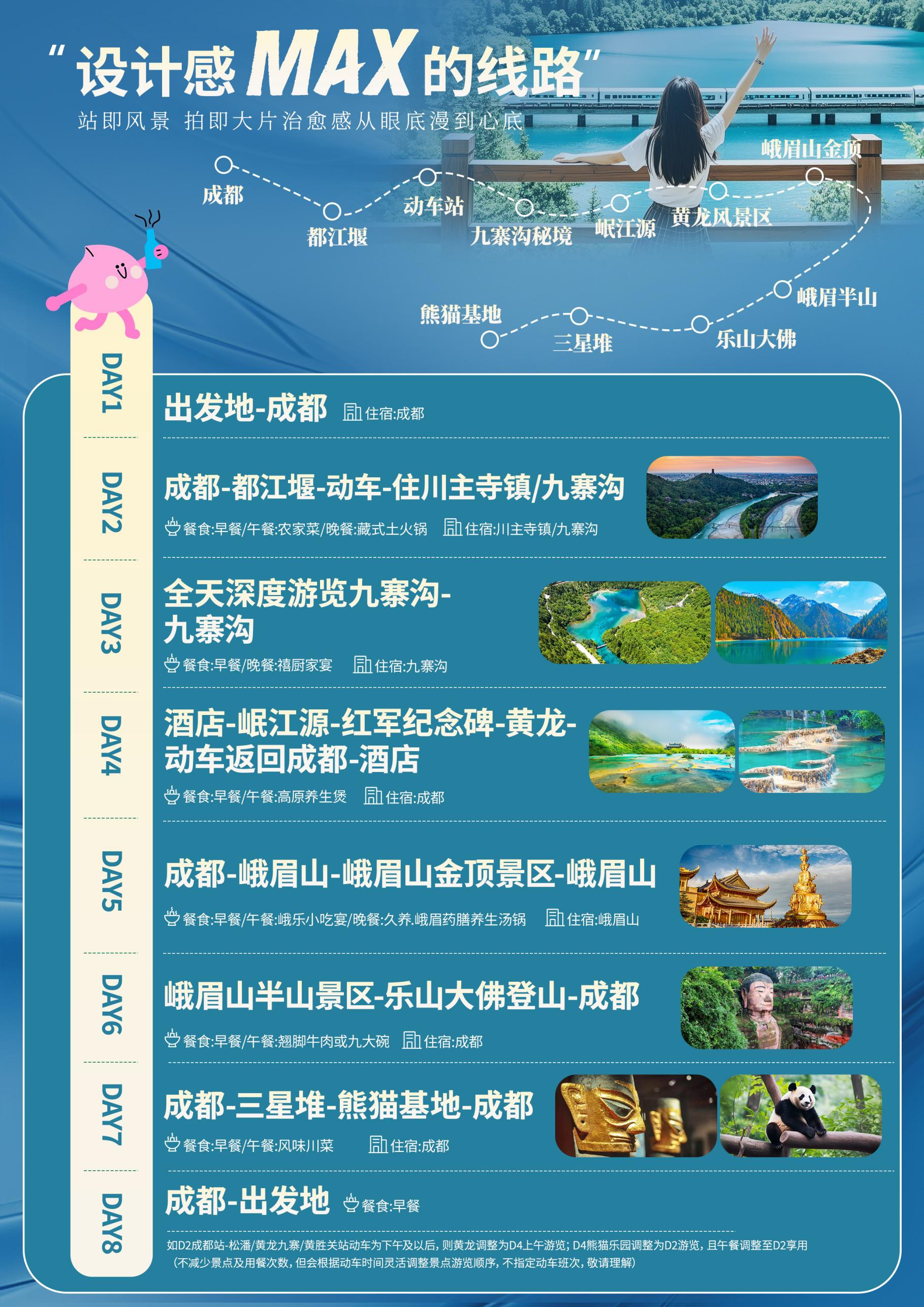 D4 | 【黄龙风景区】→松潘/黄龙九寨/黄胜关站→动车→成都 | √ | √ | × | 成都 |