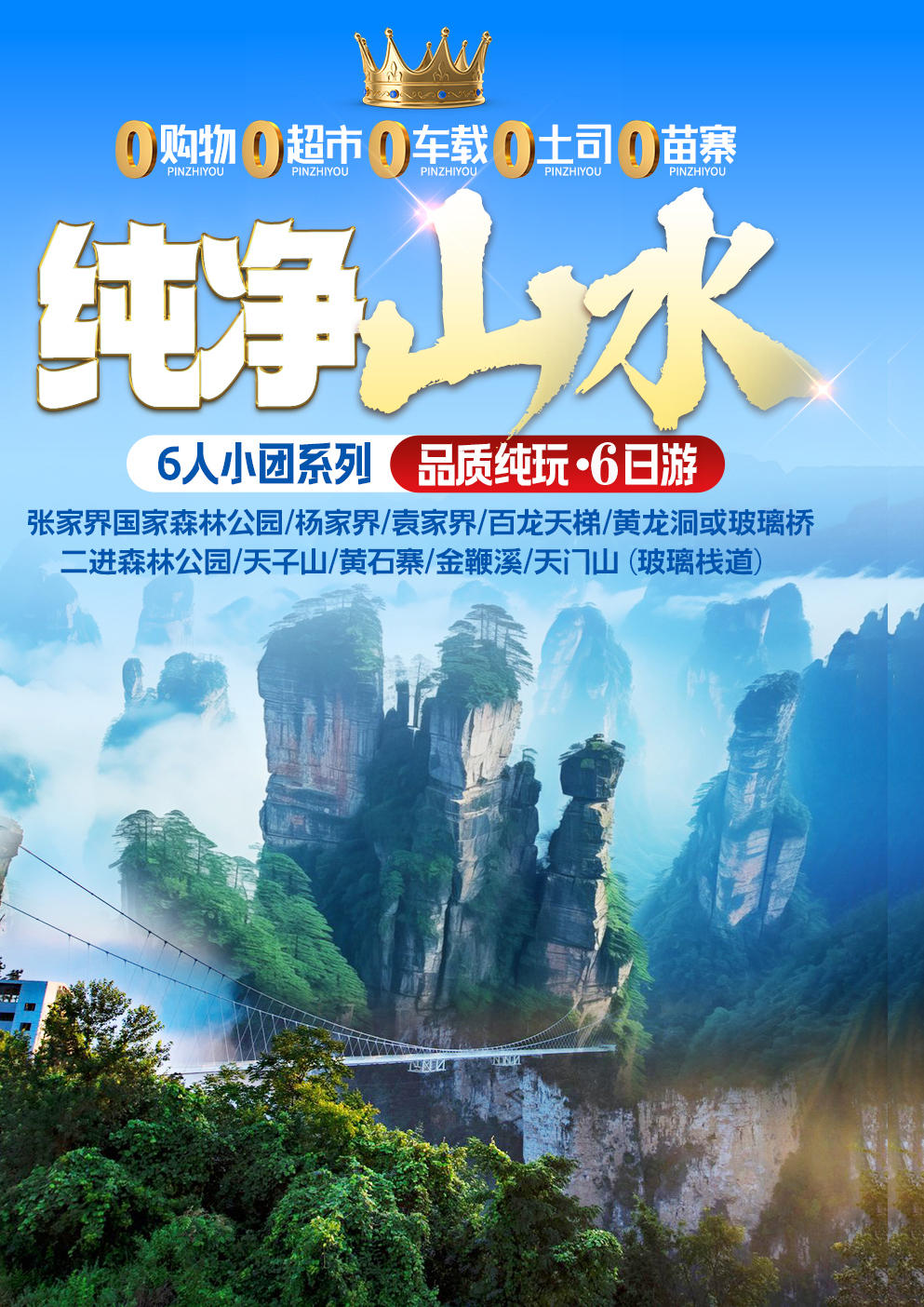 D3 | 张家界国家森林公园→杨家界→袁家界→百龙电梯→十里画廊→黄龙洞或玻璃桥 | √ | × | √ | 武陵源 |