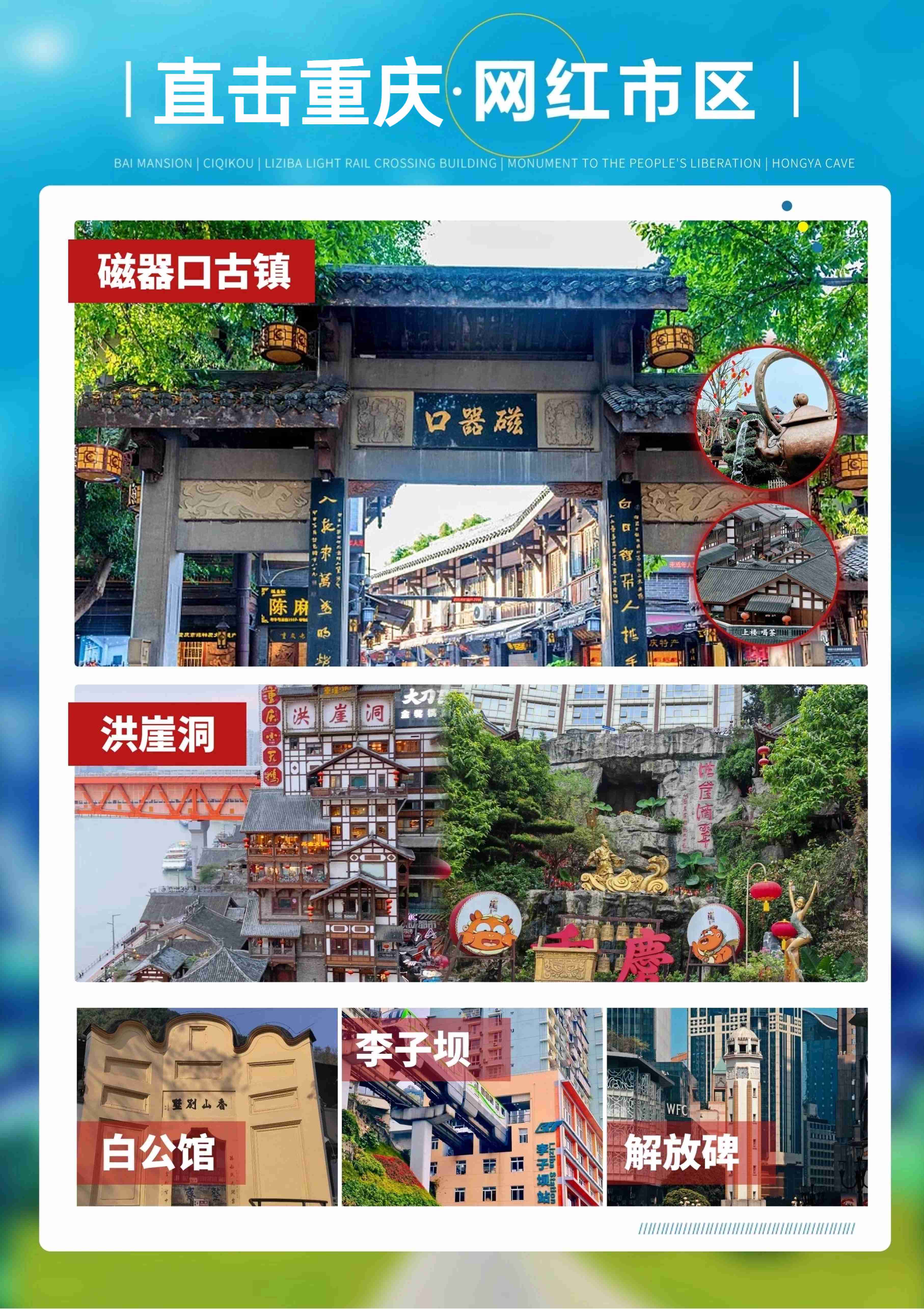 D4 | 白公馆Ø特产超市Ø磁器口Ø凤凰山Ø李子坝轻轨穿楼Ø解放碑Ø洪崖洞 | √ | × | × | 重庆 |