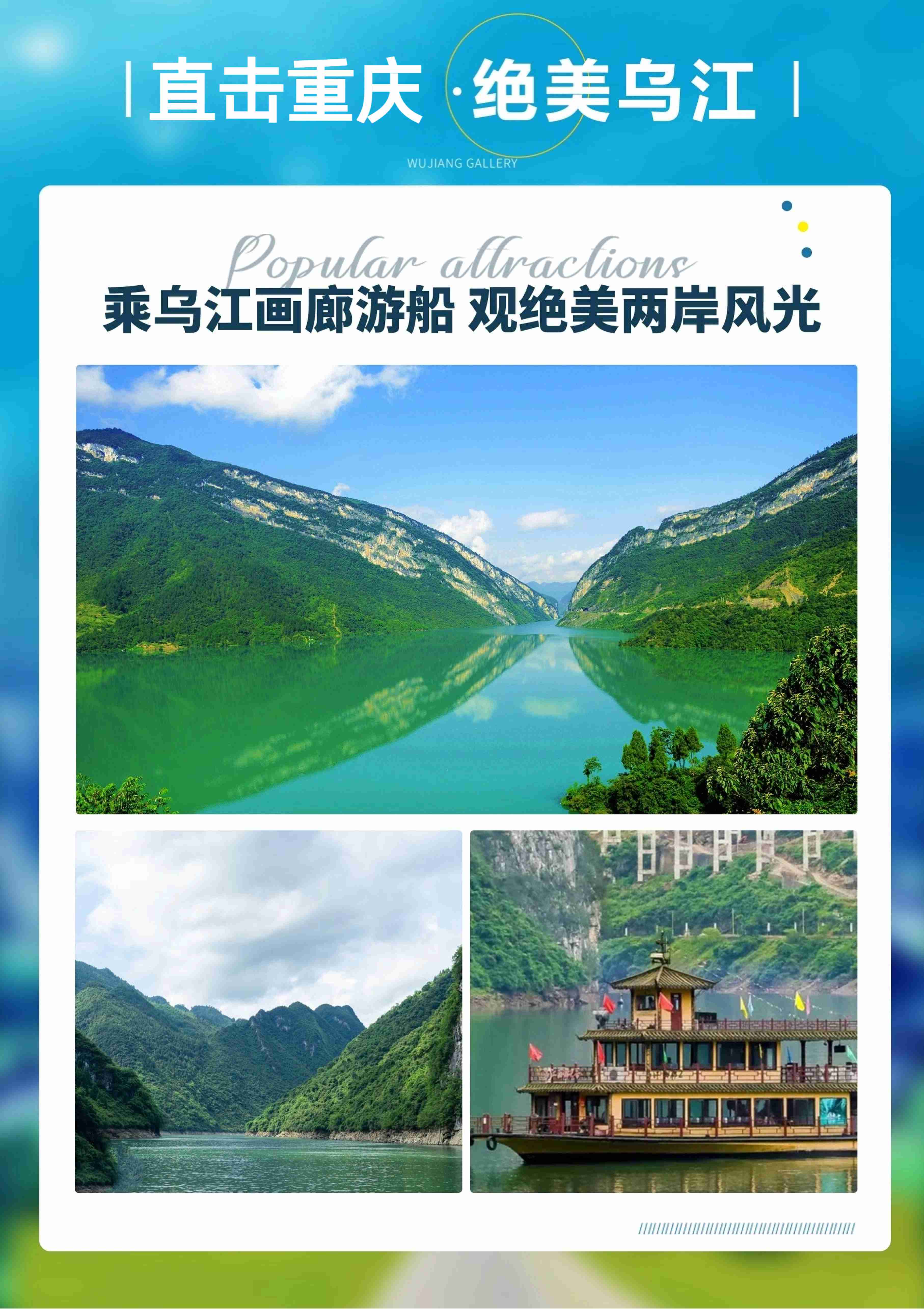 中餐后乘车前往【乌江画廊游船】,千里乌江,百里画廊景色秀丽。选择乘坐【乌江画廊游船】(游览时间不低于50分钟,乌江游船188/人费用不含,必须产生),乌江画廊两岸翠绿葱郁,山峦叠嶂,奇峰对峙,各显神姿,奇山、怪石、碧水、险滩、古镇、廊桥、纤道等构成了乌江百里画廊的景观要素,乘坐乌江画舫,便可观赏美不胜收的景致。