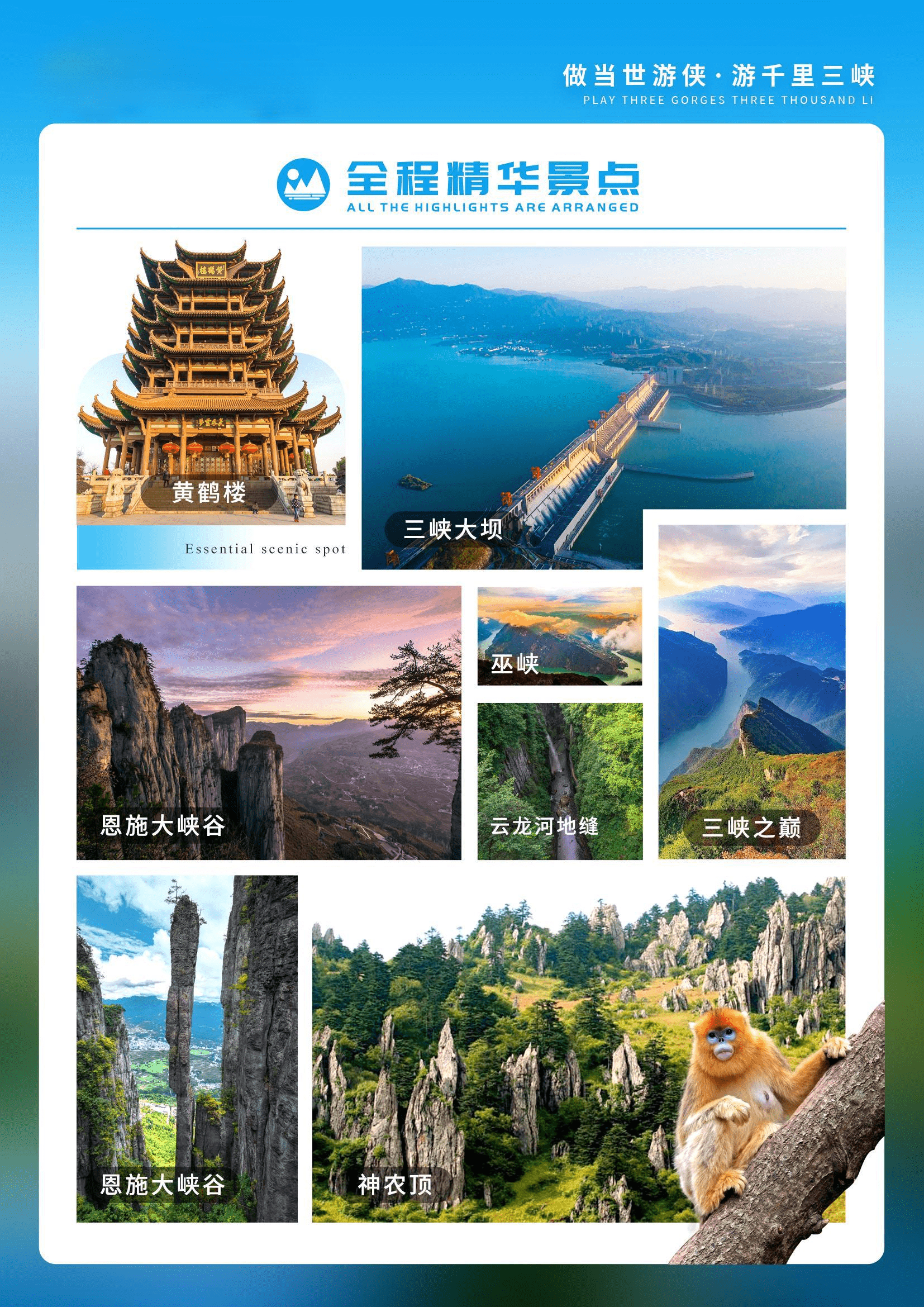 备注:3月7日-4月15日期间三峡之巅景区因人流量太大闭园整改,闭园期间三峡之巅风景区换成同级景区,国家4A级景区——【白帝城】在白帝城感受浓浓的三国文化,叹刘备托孤的无奈与悲壮,体验高峡平湖后新盆景式岛屿景观,近观夔门雄姿。将在唯美诗意中同时领略长江三峡壮美的自然景观,巴蜀大地独特的风土人情和“诗城”奉节浓厚的文化底蕴,再现“行到三峡必有诗”的盛景,
