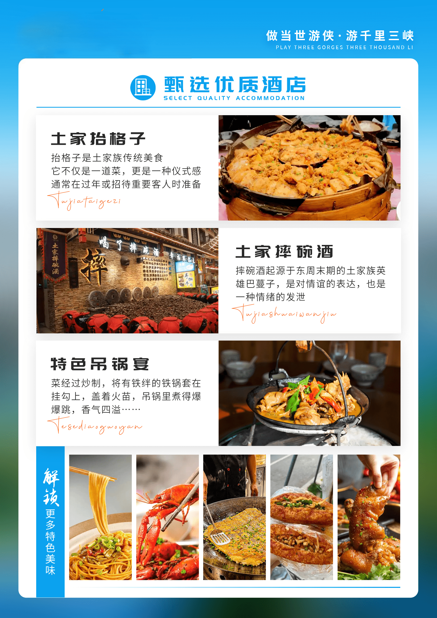 随后游客回船,乘车前往三峡之巅景区(车程约1小时),【三峡之巅】(游览时长约2个小时)三峡之巅地处长江三峡西首瞿塘峡,是长江三峡的至高点,海拔1388米,南眺白盐山,西望白帝诗城,东临巫山机场,绵延10余公里。因诗圣杜甫“赤甲白盐俱刺天,闾阎缭绕接山巅”的诗句而得名。登临此地,云雾缭绕,彩霞弥漫:放眼望去,群山连绵,峰峦鲁嶂:凌空俯瞰,玉带长江,蜿蜒飘动。踏上玻璃栈道,感受“会当凌绝顶,一览众山小”的绝世意境,一幅“悬、 险、惊、奇”交错的山水画卷尽收眼底。晚餐后,前往酒店入住。