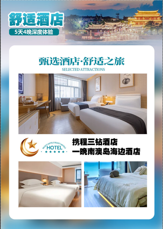 2、酒店:【酒店住宿】全程指定酒店地理位置优越、升级 1 晚连住南澳海岛海边酒店