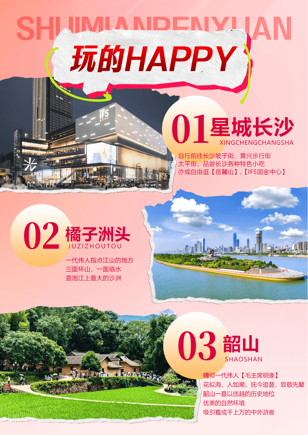 乘车游览【橘子洲】(电瓶车已含)游览山城之间,湘江之上,一代伟人指点江山的地方,“目光所至皆为华夏,五星闪耀皆为信仰”,橘子洲位于湖南省长沙市岳麓区的湘江之中,三面环山,一面临水,是湘江上最大的沙洲,回味那些年我们一起背诵的经典诗句《沁园春.长沙》,“湘江北去,橘子洲头”如今湘水依旧,伟人之风长存,橘子洲最著名的是巨大的青年毛泽东塑像,高32米,长83米,充分的展现了毛主席青年时代心怀天下的雄心壮志,和“问苍茫大地,谁主沉浮“的巍巍气魄”。