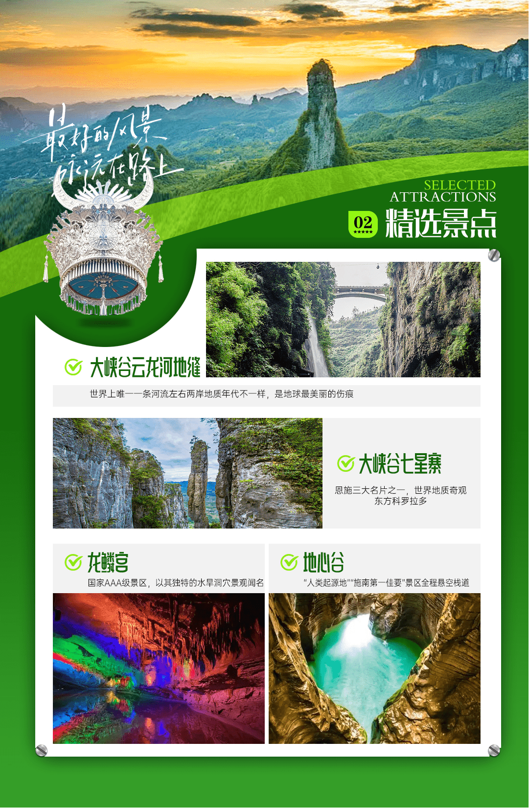 8、恩施地为少数名族聚集地,请尊重当地个人信仰和风情文化及风俗习惯。峡谷内有些地方有积水,注意不要嬉戏打闹,请做好防滑、有水滴落的准备。女儿城婚嫁表演秀由女儿城特别演出,如遇下雨等其他因素不能举行,则取消活动,游客不得以此投诉。