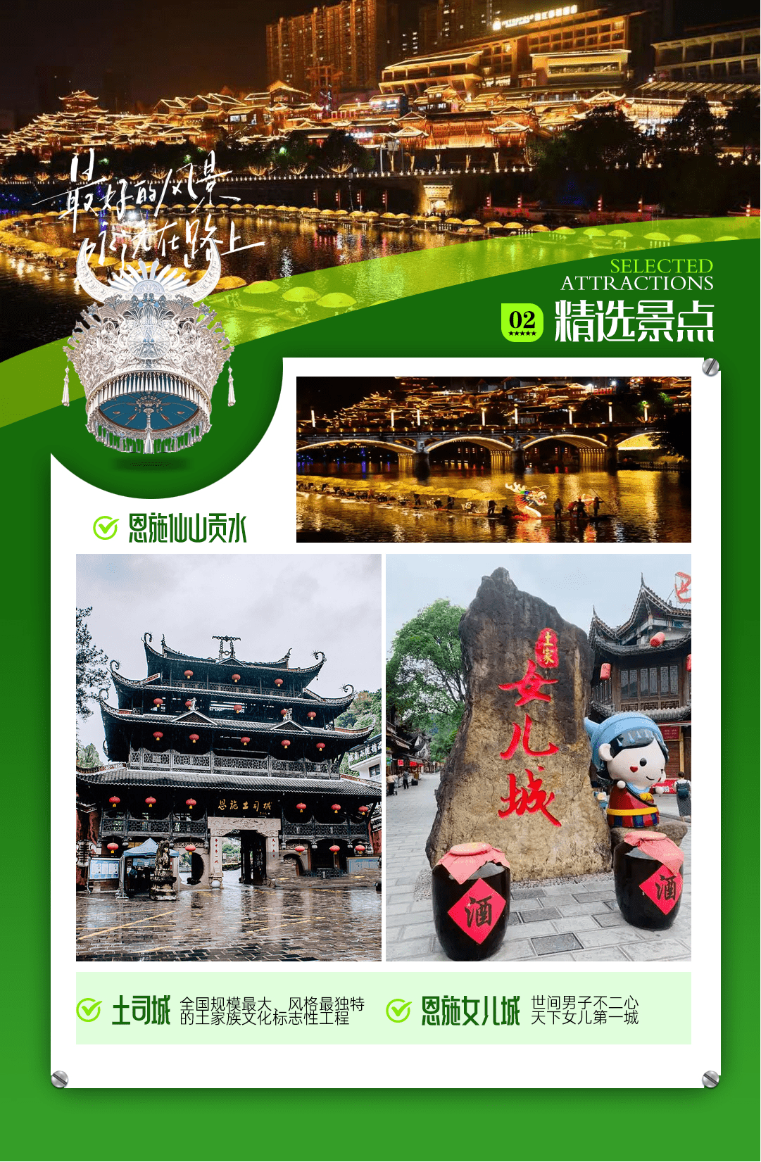 后自行游览【恩施女儿城景区】土家女儿城合理且精心的谋划了整体建筑风格,仿古与土家吊脚楼相结合,完美的体现了土家族的民风民俗。土家女儿城囊括300家小商品,500间风情客栈,30家特色餐饮,40家美味小吃,8000平景观草坪,10000平综合运动中心以及全国首创室内情景剧场-女儿城大剧院,同时还拥有湖北省内最大的水上乐园。恩施土家最负盛名的特色民俗相亲活动-女儿会,也将永久落户土家女儿城!