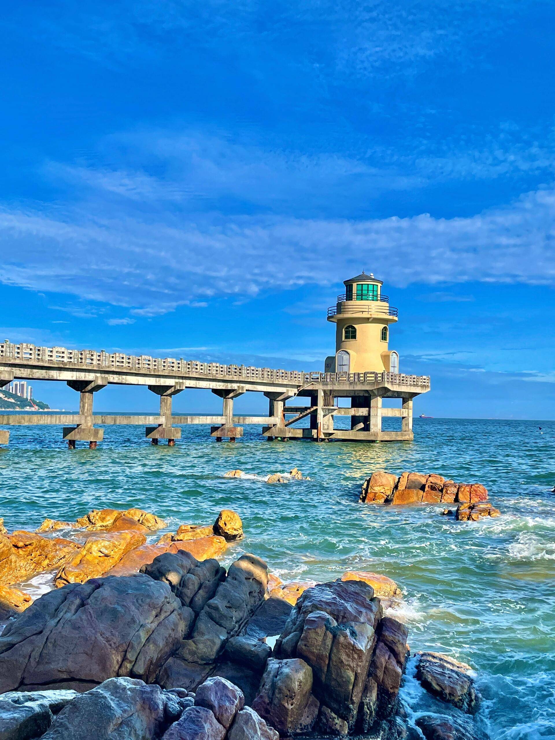 早餐后乘车往广东最美丽海岛,被称为“暖冬秘境小岛”“东方夏威夷”-【南澳岛】, 途经海上巨龙-【南澳大桥】领略海上奇观,全长约 11.08 公里;其中桥梁全长9341米,全线采用设计速度60公里小时的二级公路标准。后游览进岛前很值得停车驻足欣赏的【启航广场】海鸟翱翔,背景就是让天堑变通途的南澳大桥;【长山尾灯塔】红色塔身,黄色基底,非常的鲜艳显眼,瞬间穿越到济州岛南澳第一站网红打卡点;南澳的东南方向,灯塔一到夜晚就亮起灯,为出海的渔船指引航港口,安静地屹立在山海交界之处,和周边的环境融成一幅绝美的风景;