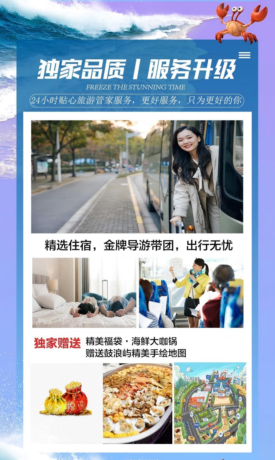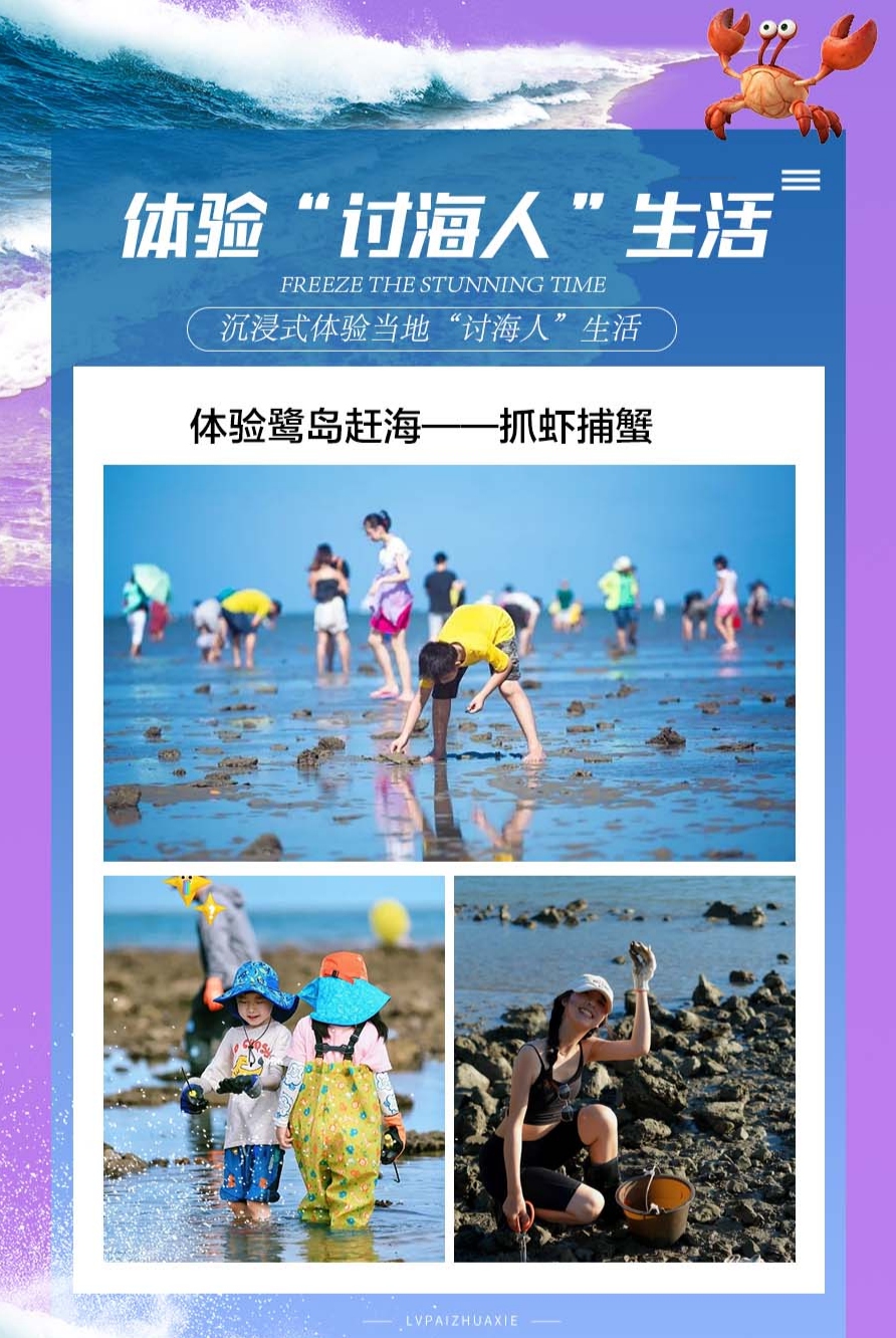 备注:由于赶海时间视潮汐时间而定,故当天行程顺序会有所调整,保证不减少景点及游玩时间~