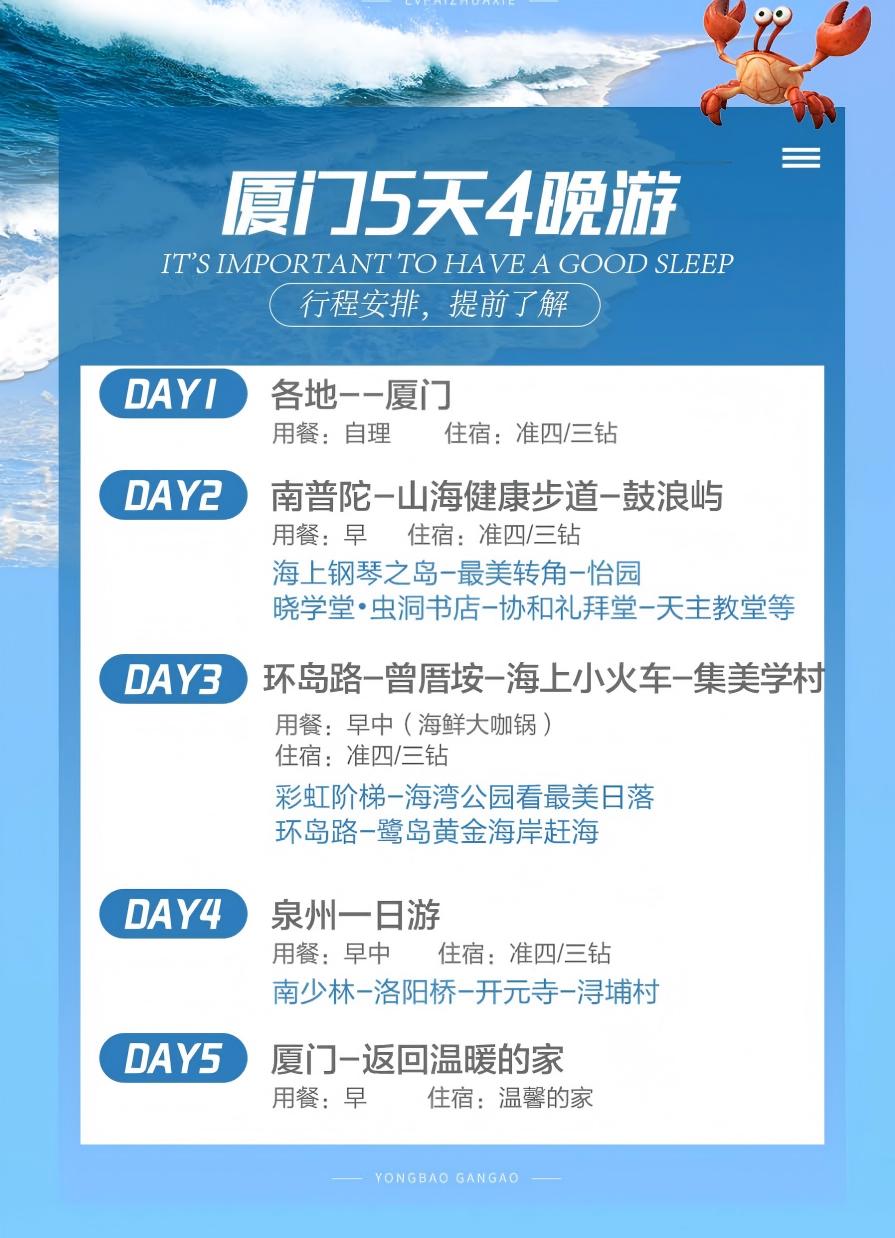 2、酒店:4晚厦门双标间,酒店无三人间或加床,落单请补单房差。