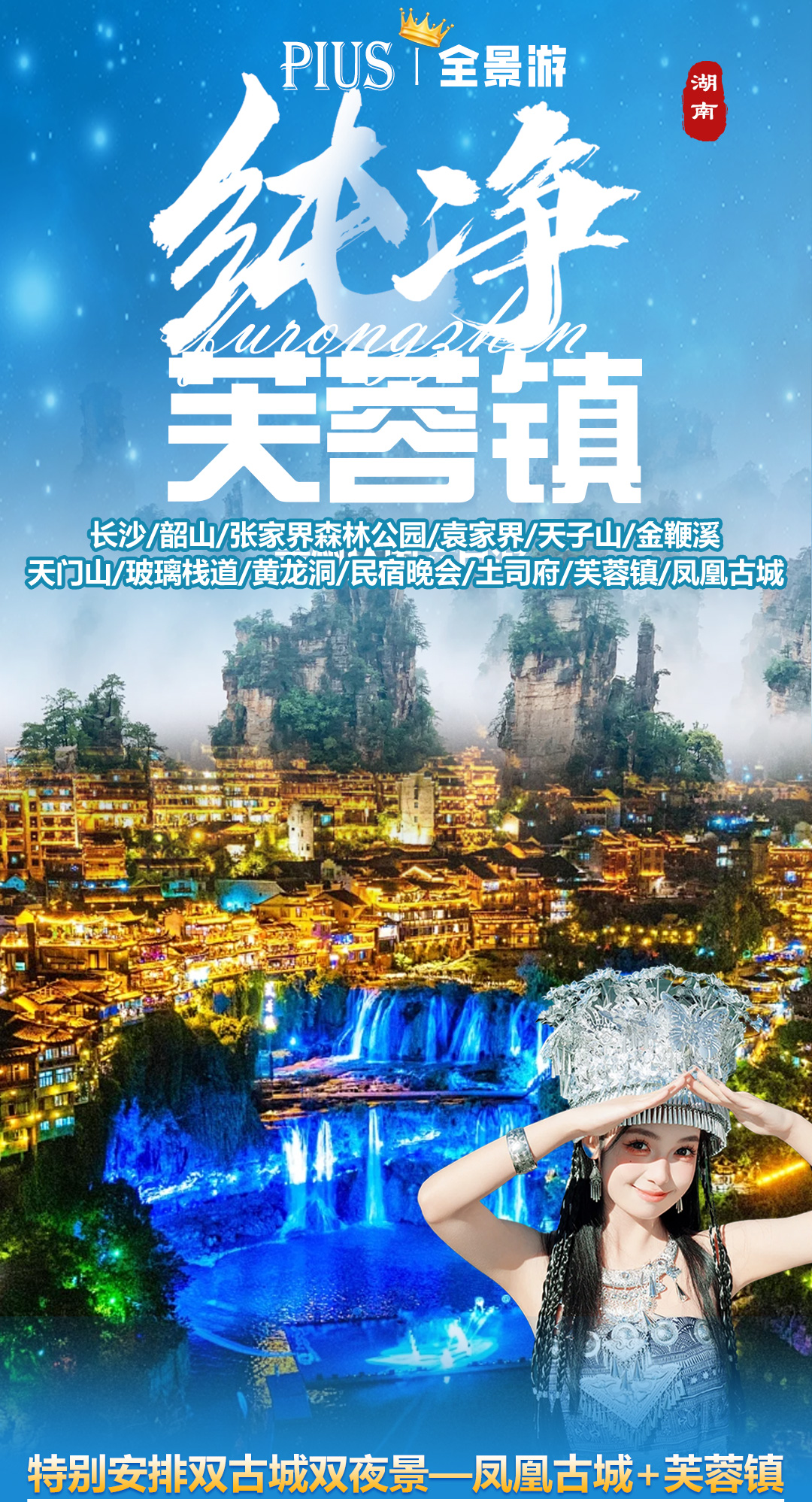 后乘车赴曾被新西兰作家路易艾黎称作中国最美丽的小城---【凤凰古城】(备注:凤凰县城内自2021年1月1日起启动凤凰县城内接驳车运输有偿服务,接驳车28元/人费用已含),途经三湘四水,鱼米之乡,身临“湖广熟、天下足”的佳境。晚上夜游凤凰古城,欣赏沱江两岸醉人夜色——带您穿越千年凤凰的必游景点!【七重灯光秀】--欣赏中国首个以苗族文化为故事线的夜游大作。本项目总投资5000多万,由近300名文旅专家、艺术家、科学家、工程师共同联手打造,以呈现苗族文化为核心,将国画、动漫、真人实拍、电影视听、实景搭建、夜游装置、光影设备等多种表现形式进行巧妙融合,一场光影科技与苗族文化的完美融合(如遇堵车、沱江水位过高或过低,大风暴雨等恶劣天气及特殊原因会停演不能正常观看,赠送项目不看不退,也不做等价交换请谅解)。