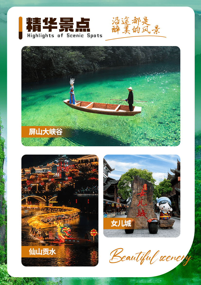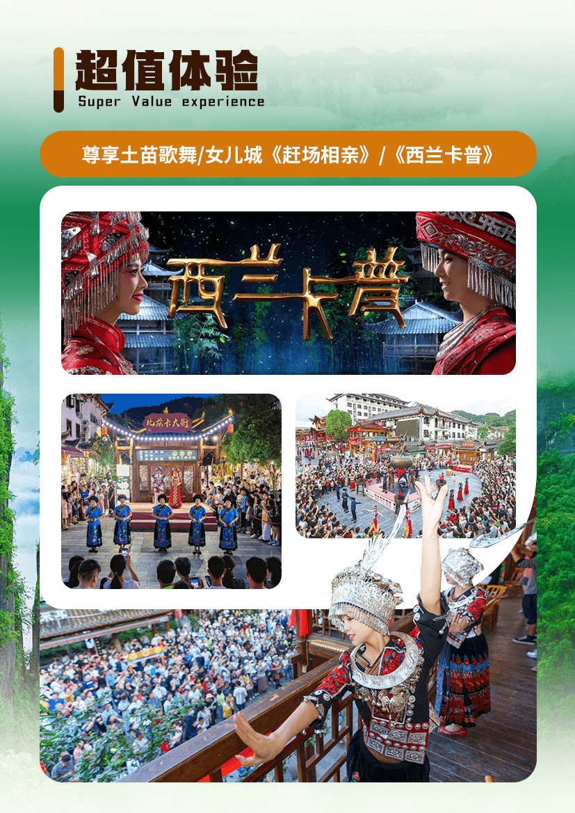 (温馨提示:女儿城表演以景区实际安排为准,若遇下雨等情况无法表演,敬请谅解,无法退任何费用;自由活动时间,请保管好随身携带物品、尊重当地民俗面貌注意人自身安全;景区内土家特色物品自愿收藏,不属旅行社购物,请谨慎消费)