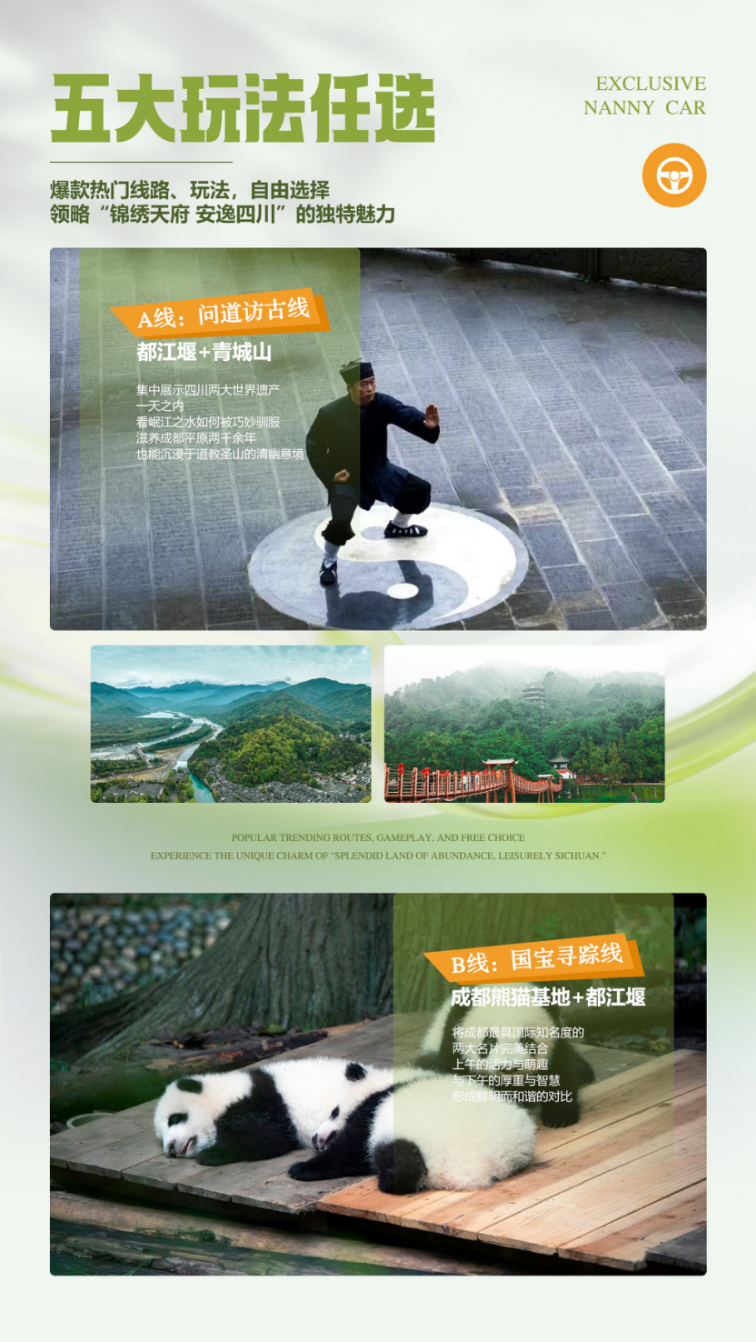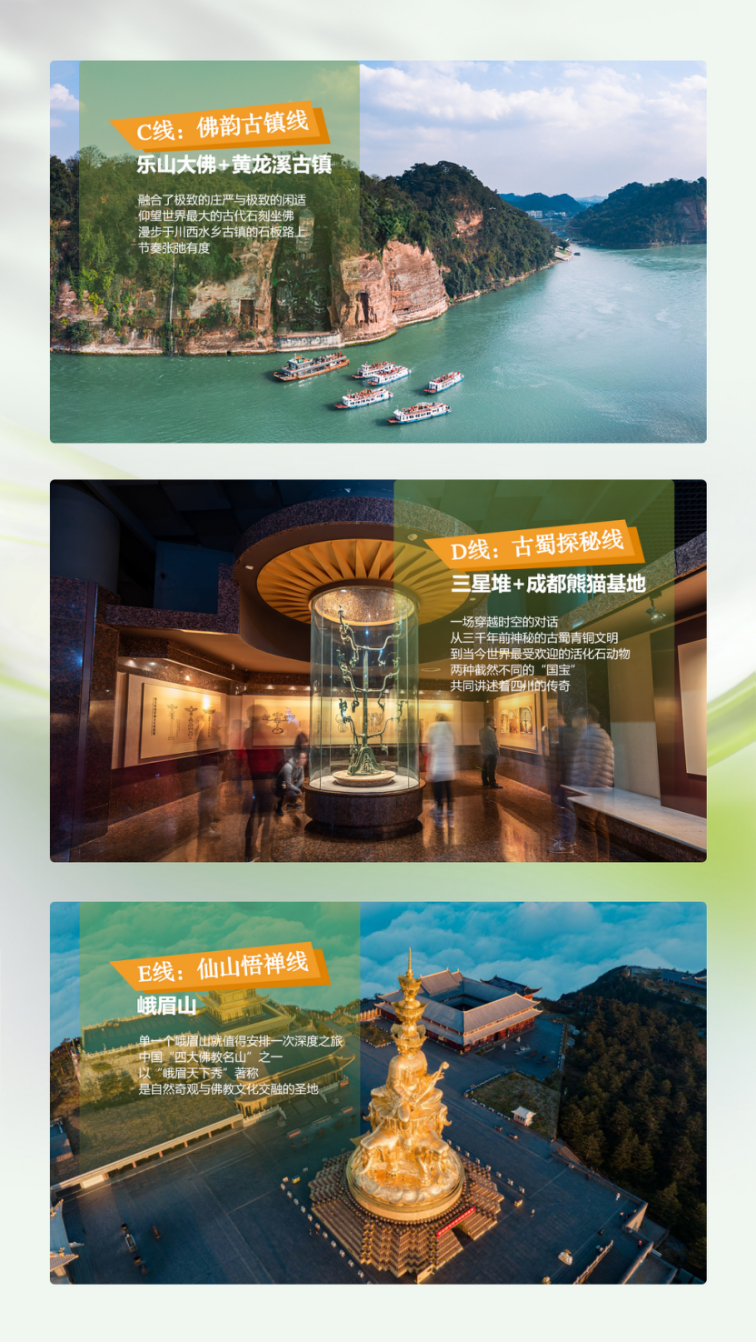 D5 | A线路Ø成都Ø都江堰Ø青城山Ø成都 B线路Ø成都Ø大熊猫基地Ø都江堰Ø成都 C线路Ø成都-三星堆Ø熊猫基地Ø成都 D线路Ø成都Ø乐山大佛Ø黄龙溪古镇Ø成都 E线路Ø成都-峨眉山一日游Ø成都 | √ | √ | — | 成都 |